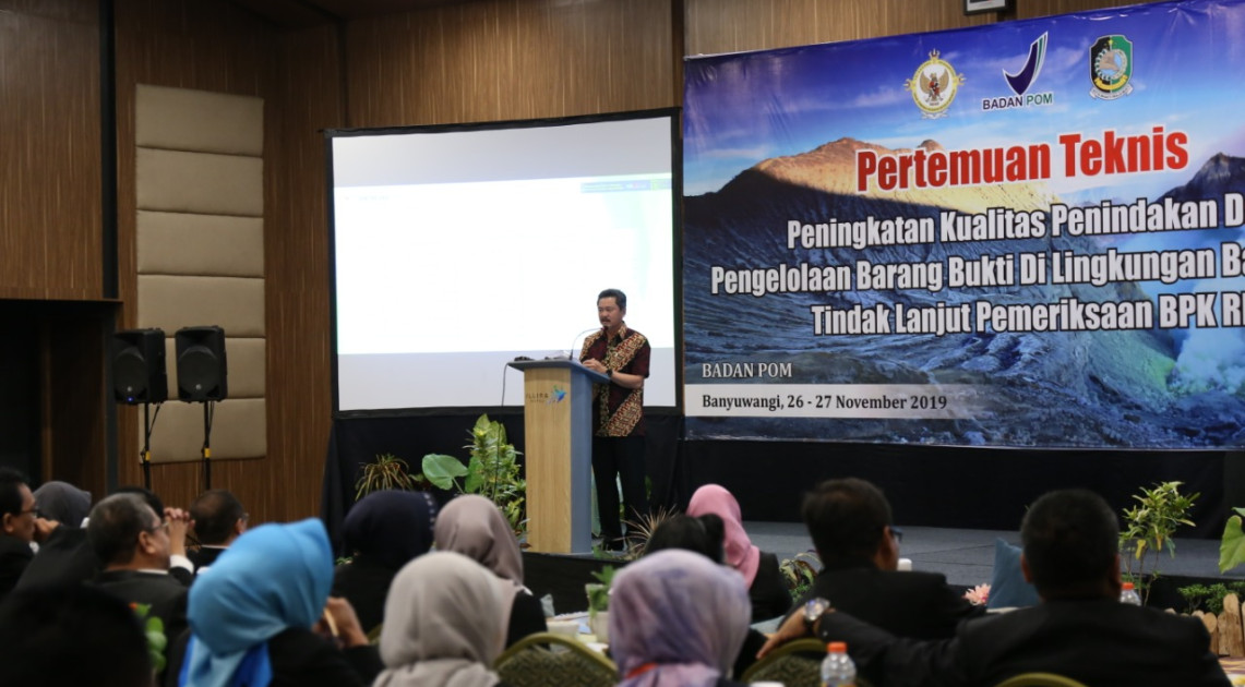 Banyuwangi – Badan POM terus melakukan pembenahan dan perkuatan, salah satunya dengan penajaman peran dan fungsi penindakan. Menindaklanjuti hasil pemeriksaan Badan Pemeriksa Keuangan, utamanya terkait kinerja Bidang Penindakan dan Pengelolaan Barang Bukti, Badan POM menyelenggarakan Pertemuan Teknis Peningkatan Kualitas Penindakan dan Pengelolaan Barang Bukti di Banyuwangi, Selasa (26/11).
