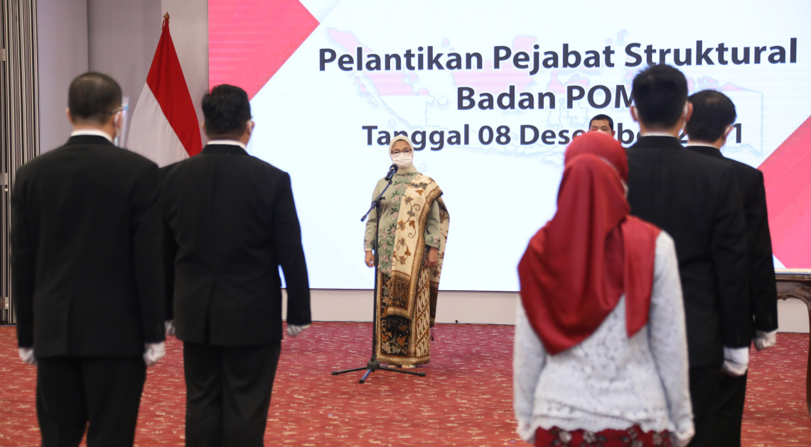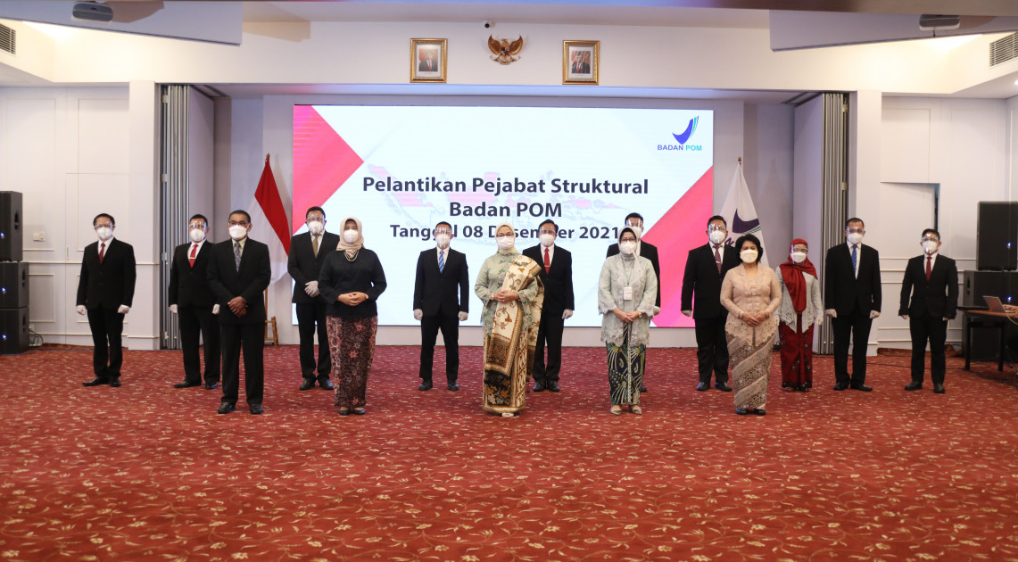 Jakarta – Kepala Badan POM RI, Penny K. Lukito kembali melantik para Pejabat Struktural di lingkungan Badan POM, Rabu (08/12). Pejabat yang dilantik terdiri dari 1 (satu) orang Kepala Balai Besar POM, 2 (dua) Orang Kepala Balai POM, 5 (lima) orang Kepala Loka POM, dan 2 (dua) Pejabat Administrasi.