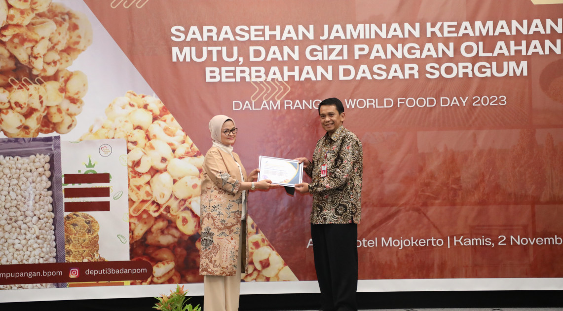 Mojokerto – Kepala BPOM, Penny K. Lukito, mengajak para pelaku usaha pangan olahan untuk memanfaatkan sorgum sebagai bahan baku pangan olahan. Penny K. Lukito menyatakan BPOM siap untuk melakukan bimbingan teknis dan pendampingan kepada para pelaku usaha terutama usaha mikro dan kecil (UMK) yang memproduksi produk olahan sorgum.