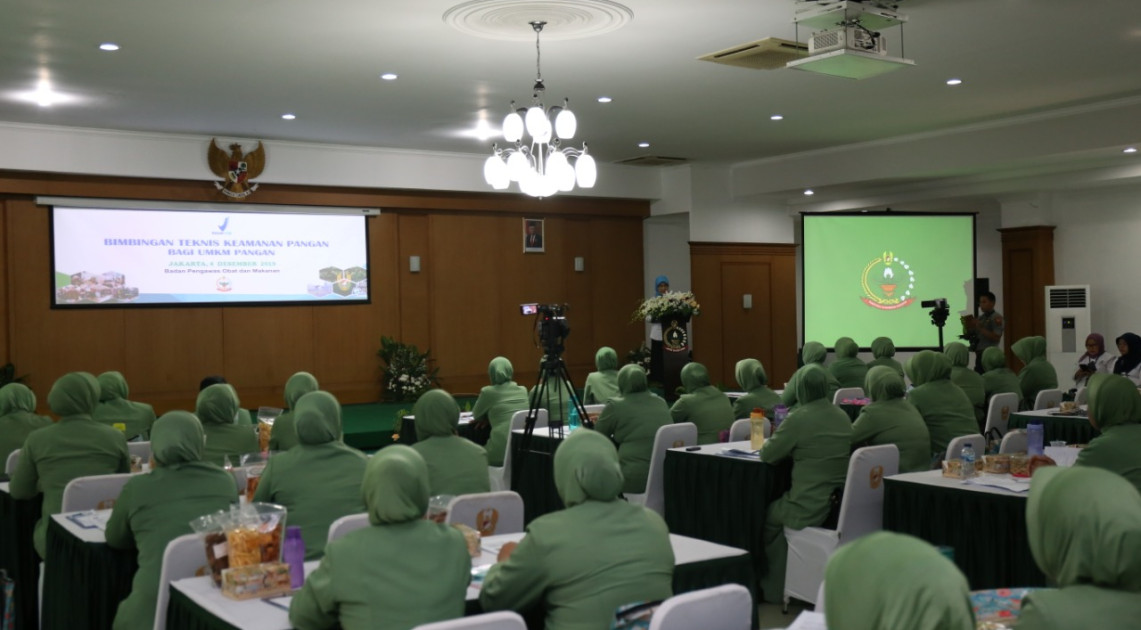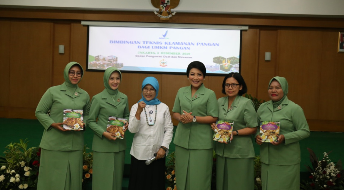 Jakarta - Badan POM bersama Persit Kartika Chandra Kirana menggelar kegiatan Bimbingan Teknis (Bimtek) keamanan pangan bagi Usaha Mikro, Kecil, dan Menengah (UMKM) pangan di Wisma Kartika (Kantor Persit Pusat) Rabu (04/12). Acara dihadiri oleh Direktur Pemberdayaan Masyarakat dan Pelaku Usaha (PMPU) Dewi Prawitasari, Ketua Umum Persit Kartika Chandra Kirana Hetty Andika Perkasa, Wakil Ketua Umum Persit Kartika Chandra Kirana Dewi Tatang Sulaiman, perwakilan Suku Dinas Kesehatan (Sudinkes) Kota Administrasi Jakarta Selatan, serta perwakilan Balai Besar POM di Jakarta.