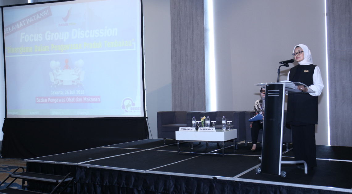 Bertempat di Hotel Grand Mercure Kemayoran, BPOM mengadakan Focus Group Discussion (FGD) untuk membahas sinergisasi dalam pengawasan produk tembakau, Jakarta (26/07). FGD ini bertujuan untuk meningkatkan sinergi dalam pengendalian produk tembakau oleh semua sektor terkait. Acara dibuka oleh Kepala BPOM, Penny K. Lukito, yang juga menjadi keynote speaker dalam kegiatan ini. Selain itu, BPOM turut mengundang narasumber dan pembicara lain diantaranya Teguh Dartanto (Lembaga Penyelidikan Ekonomi dan Masyarakat Universitas Indonesia), Siti Masyitah (The Union International), dan Nina Armando (Ketua Departemen Ilmu Komunikasi FISIP UI). Hadir pula beberapa penanggap yang berasal dari perwakilan kementerian lembaga, perwakilan pemerintah daerah, perwakilan asosiasi, dan perwakilan organisasi masyarakat.