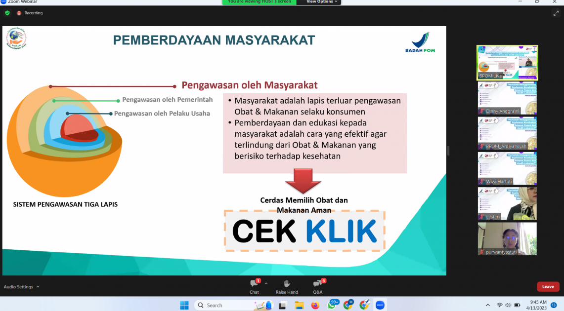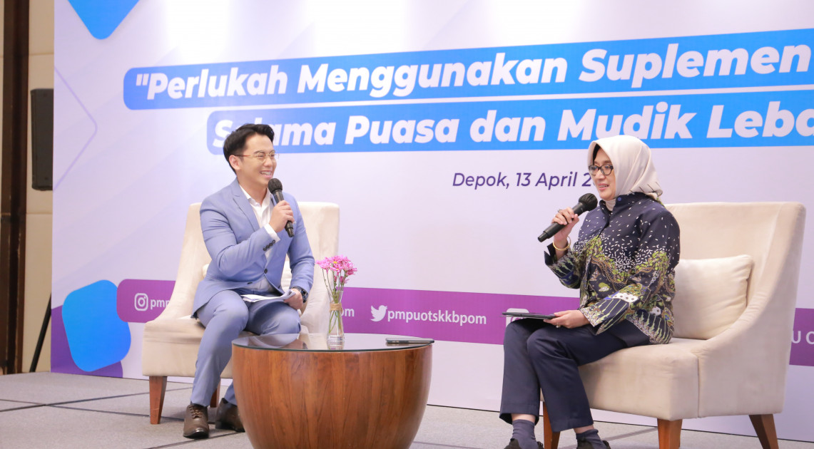 Depok – BPOM menyelenggarakan kegiatan Webinar dengan topik “Perlukah Menggunakan Suplemen Kesehatan Selama Puasa dan Mudik Lebaran?” pada Kamis (13/04/2023). Webinar ini dimaksudkan untuk meningkatkan wawasan masyarakat terhadap pentingnya meningkatkan sistem kekebalan tubuh saat menjalankan ibadah puasa di Bulan Ramadan dan mudik lebaran di tahun ini. Narasumber yang mengisi materi pada webinar kali ini, antara lain Guru Besar Fakultas Kedokteran Universitas Indonesia, Dr. Purwantyastuti; Pengajar Fakultas Farmasi Universitas Padjadjaran, Dr. Keri Lestari; serta publik figur, Citra Kirana.