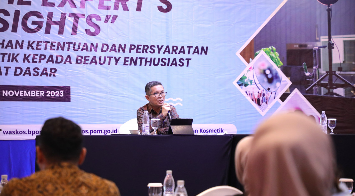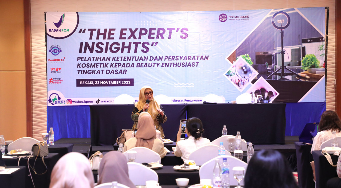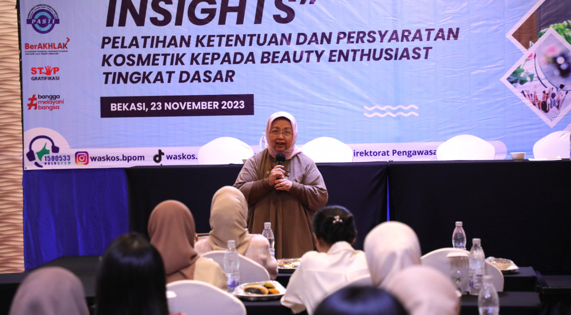Bekasi - BPOM menggelar pelatihan mengenai ketentuan dan persyaratan kosmetik bagi beauty enthusiast, Kamis (23/11/2023). Kegiatan pelatihan ini bertujuan meningkatkan pemahaman beauty enthusiast yang memiliki ribuan followers di media sosial untuk memahami ketentuan peredaran kosmetik di Indonesia.