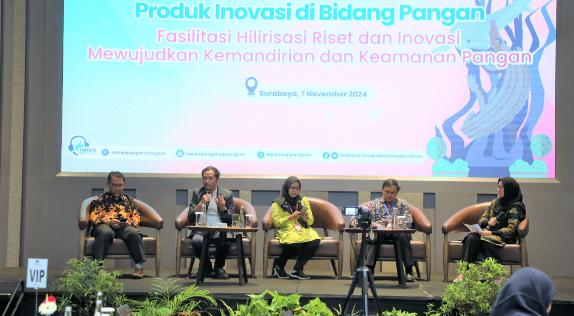 Surabaya - Kepala BPOM Taruna Ikrar membuka secara daring kegiatan Forum Komunikasi Lintas Sektor Produk Inovasi di Bidang Pangan pada Kamis (7/11/2024). Mengangkat tema “Fasilitasi Hilirisasi Riset dan Inovasi Mewujudkan Kemandirian dan Keamanan Pangan”, kegiatan ini dihadiri oleh 120 peserta yang terdiri dari peneliti, akademisi, organisasi profesi, pelaku usaha, dan kepala unit pelaksana teknis (UPT) BPOM dari seluruh Indonesia.
