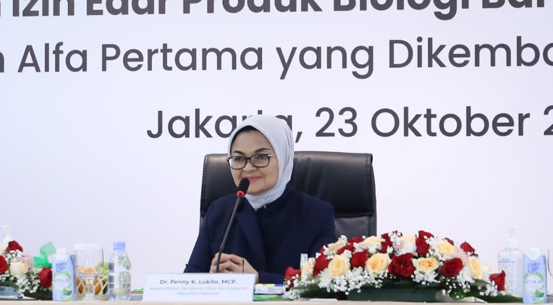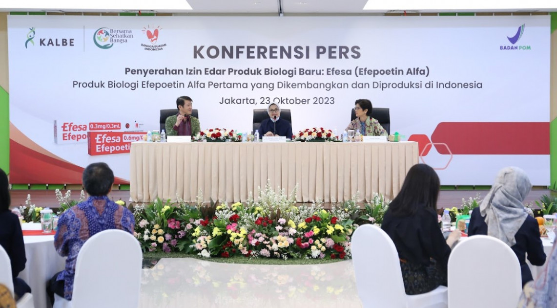 Jakarta – Kepala BPOM RI, Penny K. Lukito menyerahkan nomor izin edar (NIE) untuk Produk Jadi Efepoetin Alfa (Efesa) sebagai produk biologi baru pengembangan dalam negeri, Senin (23/10/2023). Produk yang diprakarsai oleh PT Kalbio Global Medika ini merupakan produk biopharmaceutical yang bekerja membantu produksi sel darah merah untuk pengobatan anemia pada pasien ginjal kronik tanpa dialisis.