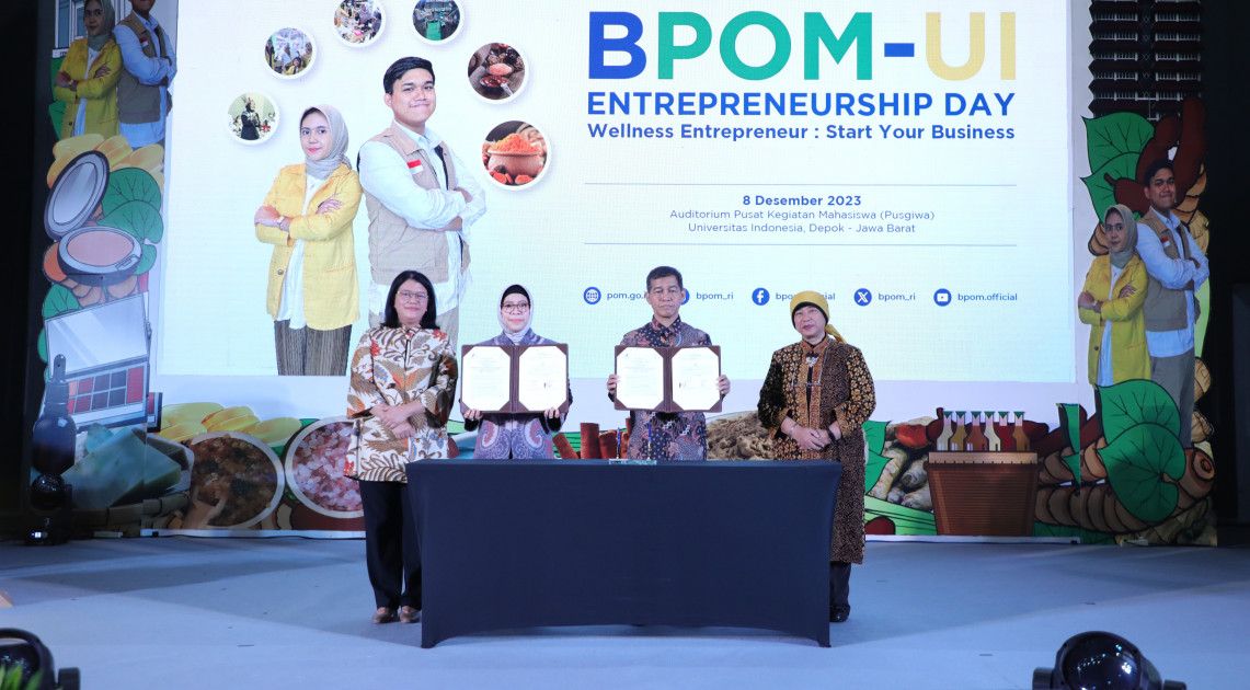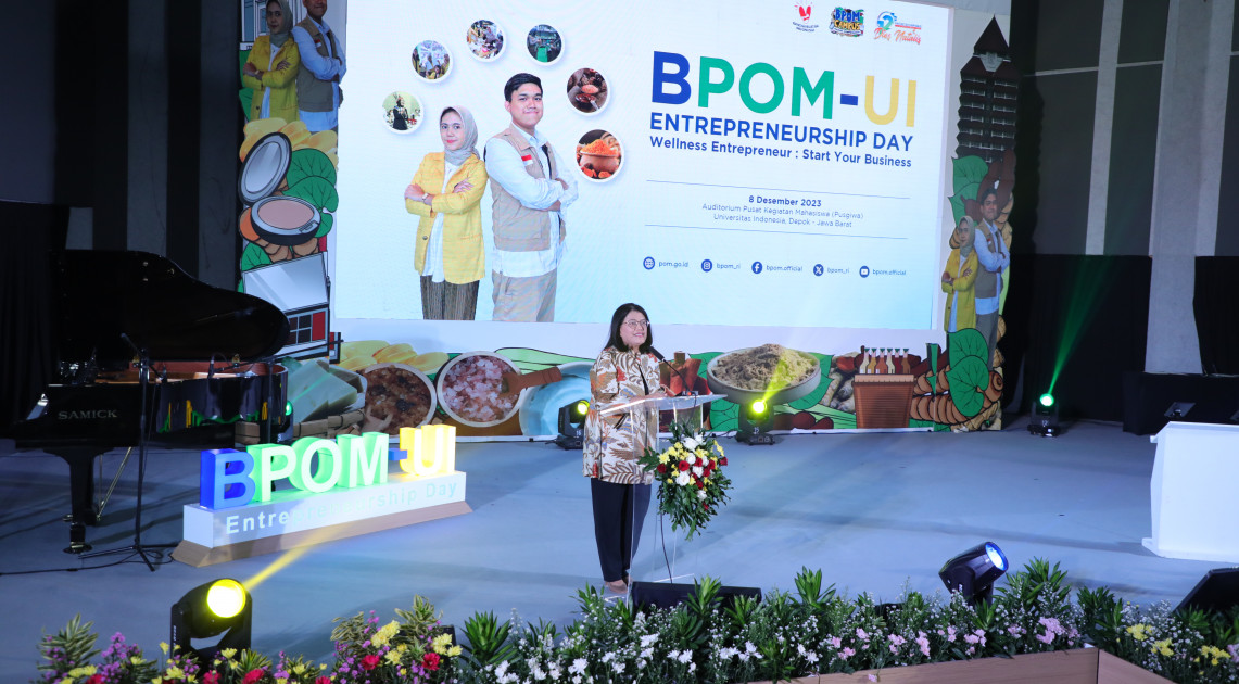 Depok - BPOM bersama Universitas Indonesia menyelenggarakan BPOM-UI: Entrepreneurship Day dengan tema Wellness Entrepreneur: Start Your Business, Jumat (08/12/2023). Kegiatan ini merupakan pilot project dari BPOM-Campus: Wellness Entrepreneurship. Sebuah program untuk mengasah mahasiswa di berbagai perguruan tinggi di Indonesia agar memiliki jiwa entrepreneurship, khususnya di bidang obat bahan alam dan kosmetik.