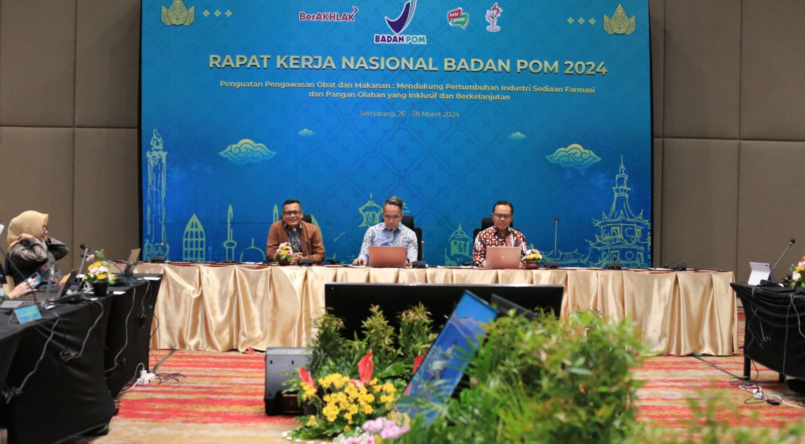 Semarang – BPOM menggelar Rapat Kerja Nasional (Rakernas) dengan tema “Mendukung Pertumbuhan Industri Sediaan Farmasi dan Pangan Olahan yang Inklusif dan Berkelanjutan”, Selasa–Kamis (26–28 Maret 2024). Kegiatan ini merupakan forum konsolidasi mengenai kontribusi BPOM dalam rancangan Rencana Pembangunan Jangka Menengah Nasional (RPJMN) serta Rencana Strategis BPOM tahun 2025–2029.