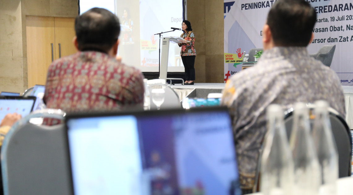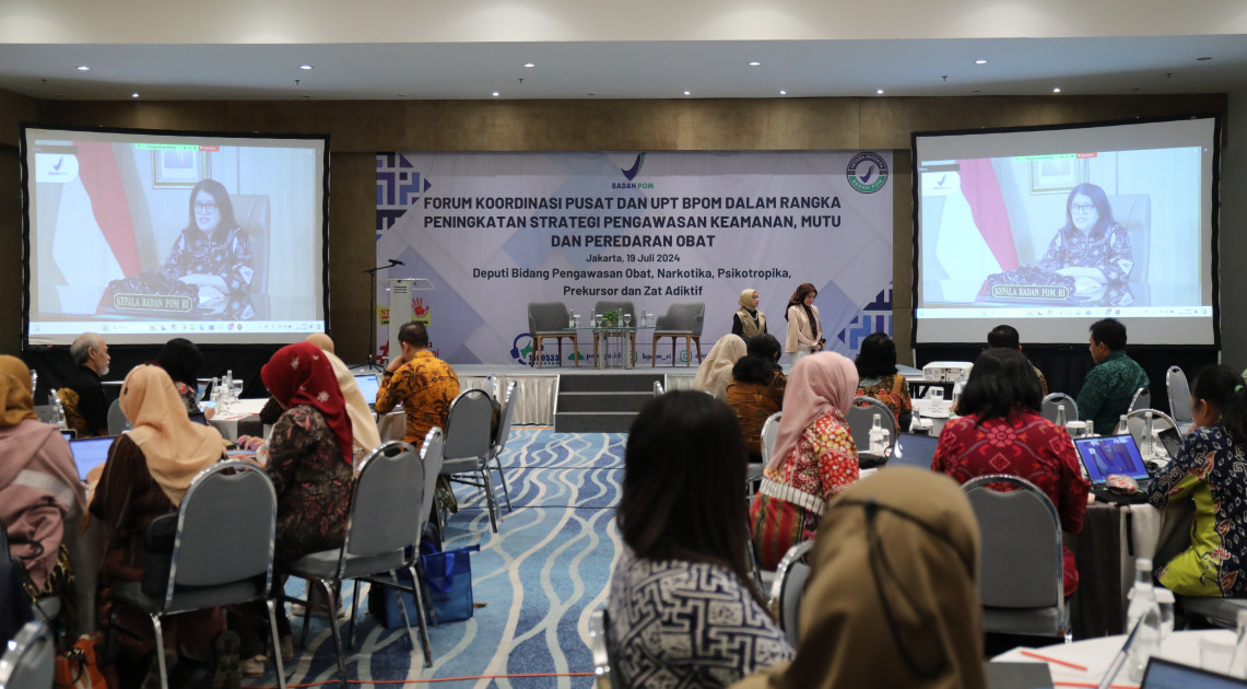 Jakarta - BPOM mengadakan Forum Koordinasi Pusat dan UPT BPOM Dalam Rangka Peningkatan Strategi Pengawasan Keamanan, Mutu, dan Peredaran Obat pada Jumat (19/7/2024). Kegiatan dihadiri oleh perwakilan 42 Kepala Balai Besar/Balai POM dan 34 Kepala Loka POM di seluruh Indonesia, baik secara luring maupun daring. Hadir pula para direktur di lingkungan Kedeputian Bidang Pengawasan Obat, Narkotika, Psikotropika, Prekursor, dan Zat Adiktif (Kedeputian 1), Kedeputian Bidang Penindakan (Kedeputian 4), staf, serta peserta eksternal dari Direktorat Jenderal Kefarmasian dan Alat Kesehatan Kementerian Kesehatan dan Dinas Kesehatan Provinsi DKI Jakarta.