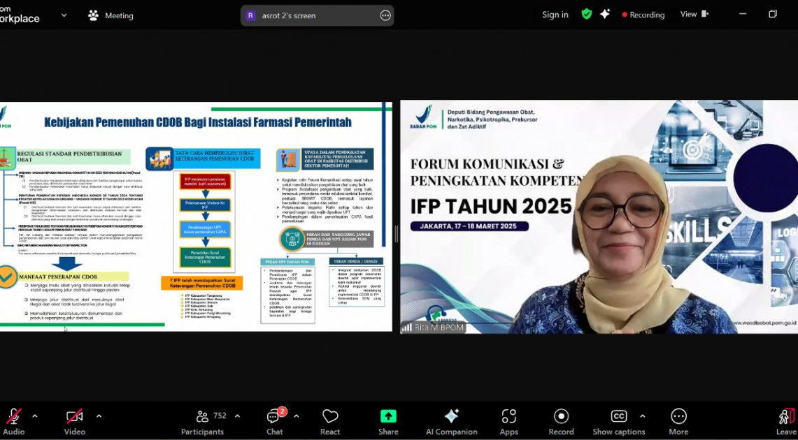 Jakarta - BPOM menggelar Forum Komunikasi dan Peningkatan Kompetensi Bagi Instalasi Farmasi Pemerintah yang digelar secara hybrid (luring dan daring) pada Senin (17/3/2025). Penyelenggaraan forum bertujuan meningkatkan komitmen instalasi farmasi pemerintah (IFP) dalam pengelolaan obat sesuai dengan standar cara distribusi obat yang baik (CDOB).