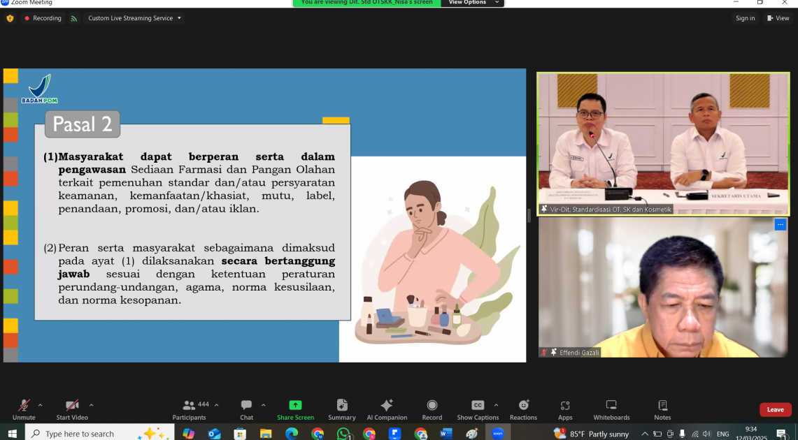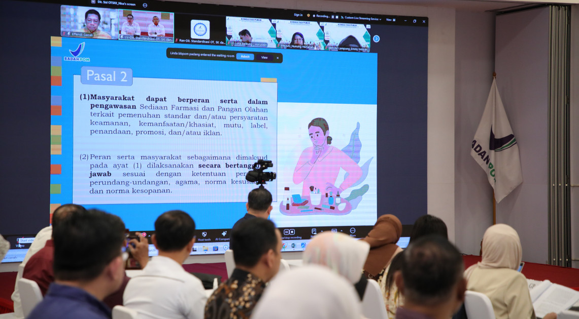 Jakarta - BPOM menggelar konsultasi publik terkait rancangan Peraturan BPOM (PerBPOM) tentang Pengawasan Sediaan Farmasi dan Pangan Olahan Melalui Peran Serta Masyarakat pada Rabu (12/3/2025). Kegiatan yang diselenggarakan secara hybrid ini berlangsung di Gedung Bhinneka Tunggal Ika dan melalui platform Zoom dengan tujuan menyampaikan rancangan PerBPOM tersebut dan mengumpulkan tanggapan, serta umpan balik dari berbagai pihak. Konsultasi publik ini juga bertujuan mengidentifikasi tantangan serta kebutuhan dalam implementasi peraturan tersebut.