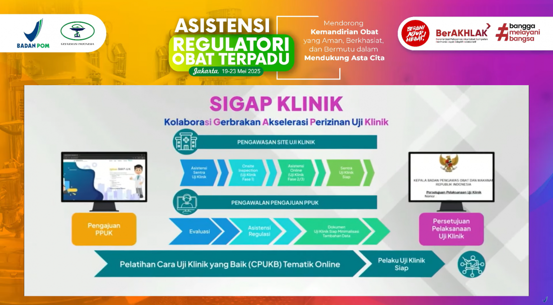 Program kedua yang diluncurkan adalah SIGAP KLINIK, Kolaborasi Gebrakan Akselerasi Perizinan Uji Klinik. Program ini bertujuan mempercepat proses persetujuan uji klinik dan meningkatkan kapasitas pelaksanaannya di Indonesia. Melalui program ini, BPOM mendampingi unit penelitian klinik secara langsung—baik secara daring maupun luring—selama proses perizinan berlangsung. Selain itu, proses pengajuan persetujuan uji klinik ditargetkan selesai dalam waktu 20 hari kerja dengan meminimalkan permintaan data tambahan. Sebagai pelengkap, BPOM juga menyelenggarakan pelatihan daring selama 2 hari terkait cara uji klinik yang baik (CUKB), yang dapat diakses secara gratis oleh para pelaku uji klinik. Inisiatif ini diharapkan mampu menciptakan iklim riset yang kondusif dan efisien dalam mendukung pengembangan obat dalam negeri.
