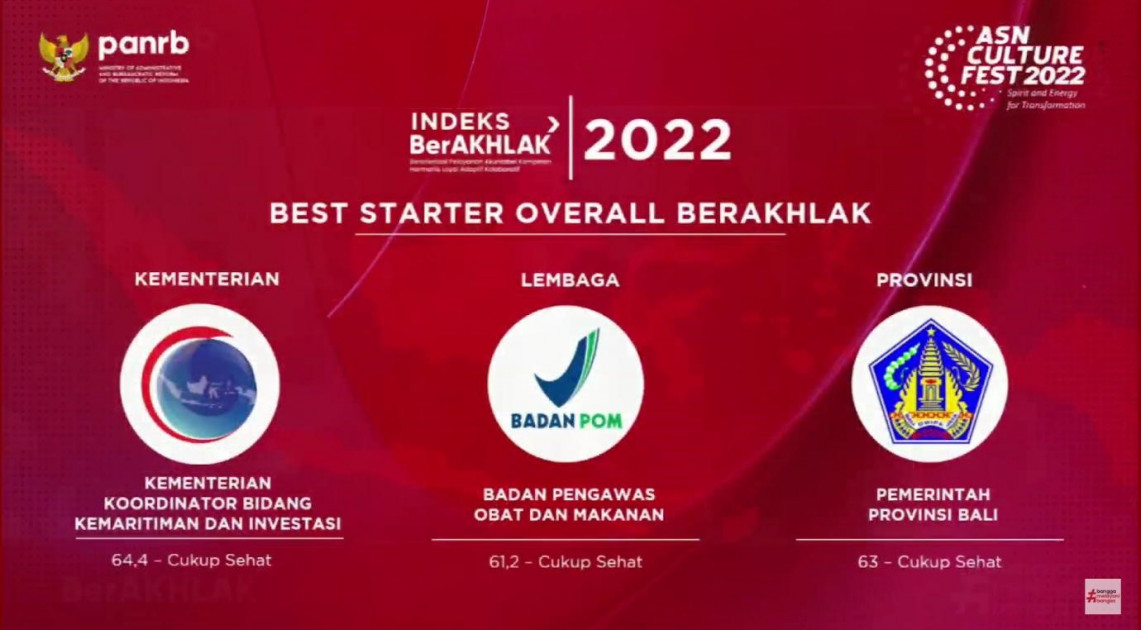 Sekretaris Utama BPOM, Rita Mahyona hadir langsung menerima penghargaan tersebut mewakili Kepala BPOM RI. Turut hadir pada gelaran ASN Culture Fest 2022 yang diselenggarakan secara hybrid tersebut adalah Menteri PANRB, Abdullah Azwar Anas, serta undangan dari 90 instansi pemerintah lainnya.