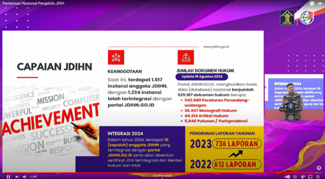 Penyerahan penghargaan dilaksanakan bersamaan dengan Pertemuan Nasional Pengelola Jaringan Dokumentasi dan Informasi Hukum Tahun 2024. Pertemuan nasional ini bertujuan memberikan apresiasi berupa penghargaan tahunan bagi anggota Jaringan Dokumentasi dan Informasi Hukum Nasional (JDIHN) terbaik dalam mengelola dokumen dan informasi hukumnya berdasarkan penilaian kinerja pada masing-masing anggota JDIHN di tahun 2023.
