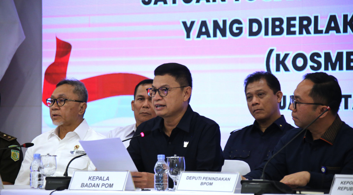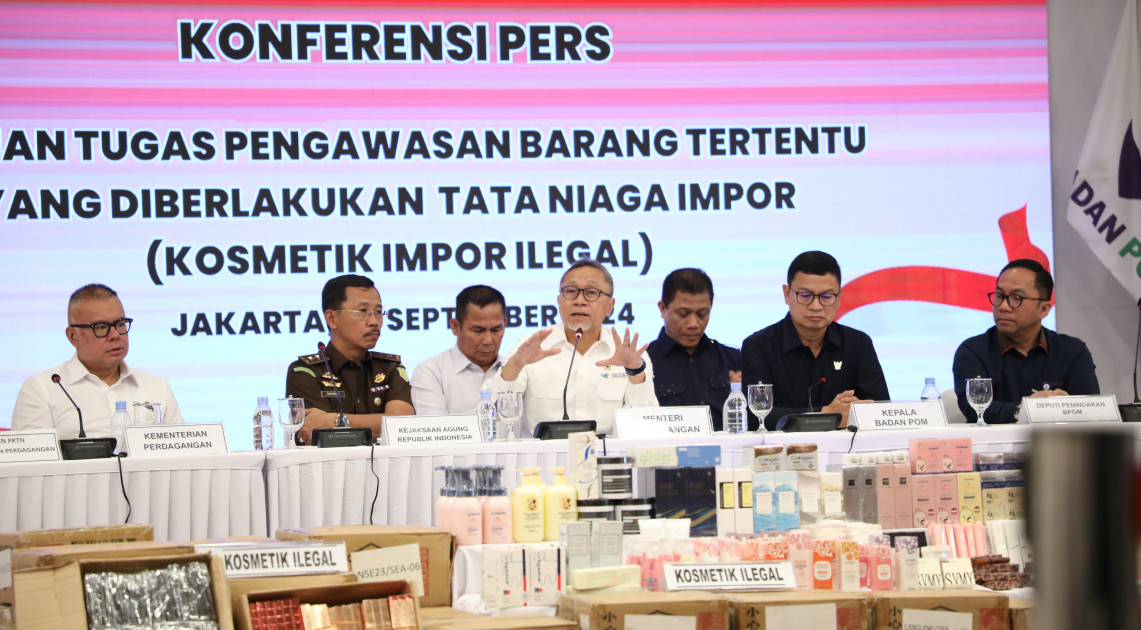Jakarta – BPOM menggelar konferensi pers bersama Satuan Tugas (Satgas) Pengawasan Barang Tertentu yang Diberlakukan Tata Niaga Impor (Kosmetik Impor Ilegal) di Aula Bhinneka Tunggal Ika BPOM, Senin (30/9/2024). Konferensi pers tersebut memaparkan hasil pengawasan antar-kementerian/lembaga yang berhasil mengamankan produk kosmetik impor ilegal senilai lebih dari Rp11,4 miliar. Produk tersebut merupakan hasil operasi penindakan dan intensifikasi pengawasan di berbagai wilayah di Indonesia selama periode Juni hingga September 2024.