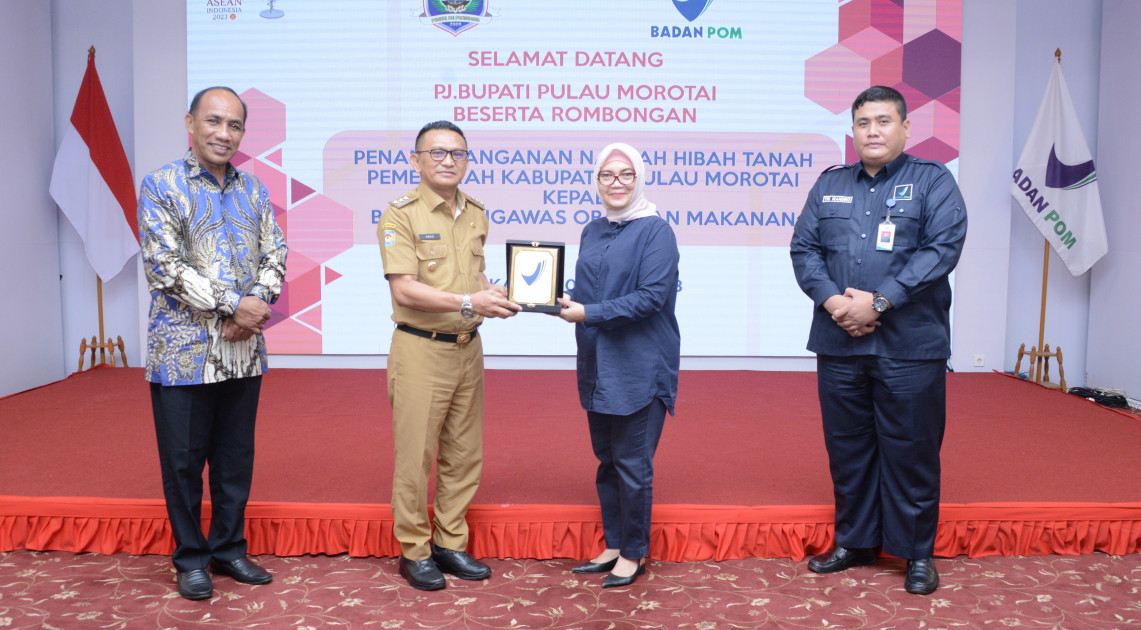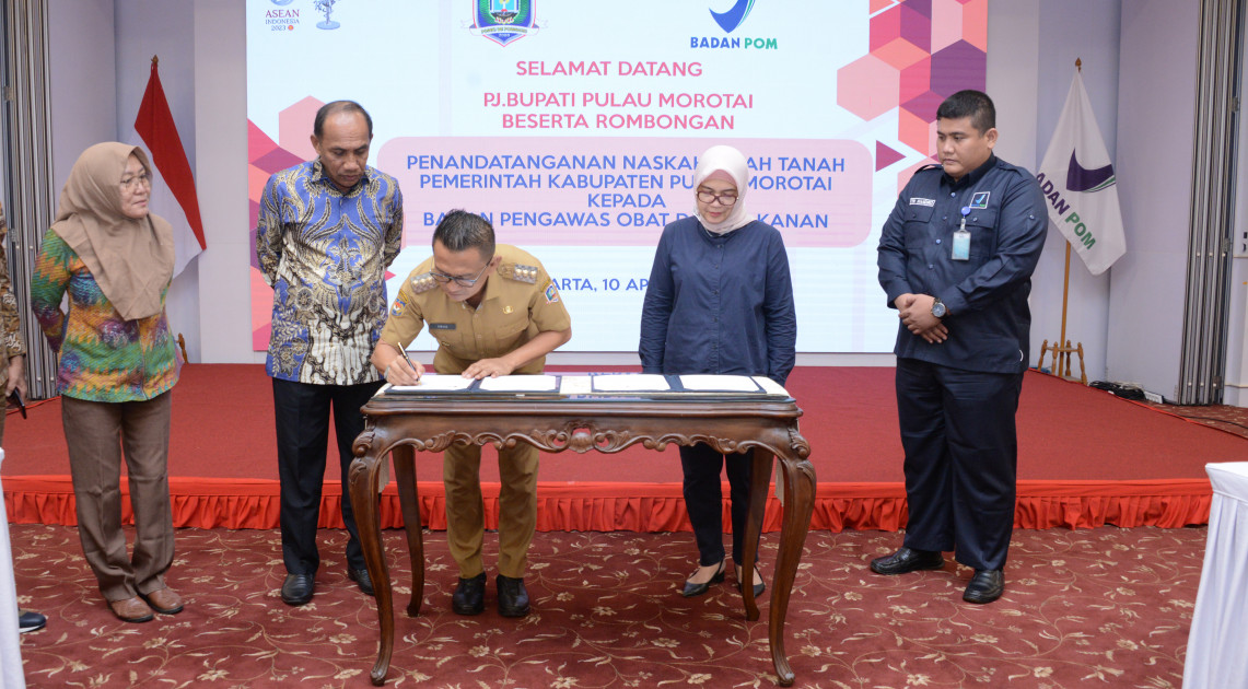Jakarta - Senin (10/04/2023), BPOM menerima kunjungan dari Penjabat (Pj) Bupati Pulau Morotai, Muhammad Umar Ali. Kunjungan tersebut diterima langsung oleh Sekretaris Utama BPOM, Rita Mahyona di Aula Bhinneka Tunggal Ika. Dalam kunjungan tersebut, PJ Bupati Pulau Morotai dan Sekretaris Utama melakukan penandatanganan Naskah Hibah Tanah Pemerintah Kabupaten Morotai kepada BPOM.