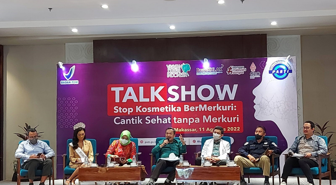 Badan POM kembali hadir untuk memberikan edukasi kepada masyarakat secara berksinambungan melalui Webinar Series : STOP Kosmetika BerMerkuri! dengan mengusung tema kali ini, yaitu Cantik Sehat Tanpa Merkuri. Acara ini diadakan dengan melibatkan praktisi kesehatan, lintas sektor terkait, asosiasi dan komunitas, para pelajar dan mahasiswa sebagai perwakilan generasi milenial, pelaku usaha di bidang kosmetika, dan tentunya public figure Puteri Indonesia Sulawesi Selatan Tahun 2022 yang dilaksanakan secara hybrid di kota Makassar. Kegiatan ini difokuskan agar para wanita Indonesia khususnya di wilayah provinsi Sulawesi Selatan lebih memilih menggunakan kosmetika berbahan alam asli Indonesia, yang penggunaannya lebih aman untuk kesehatan sebagai alternatif pengganti merkuri.