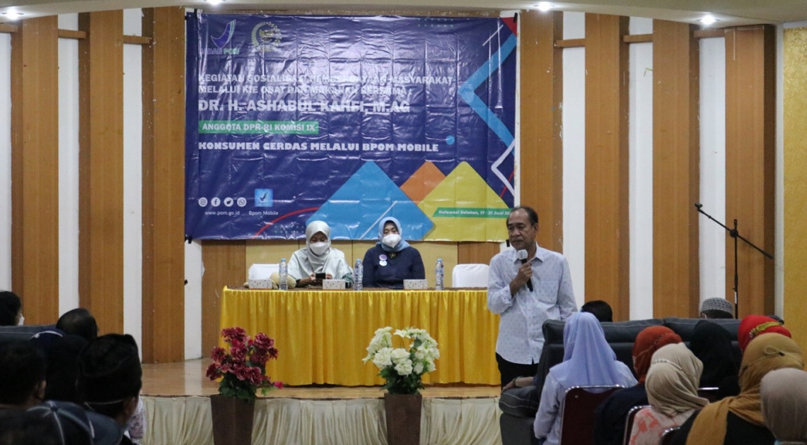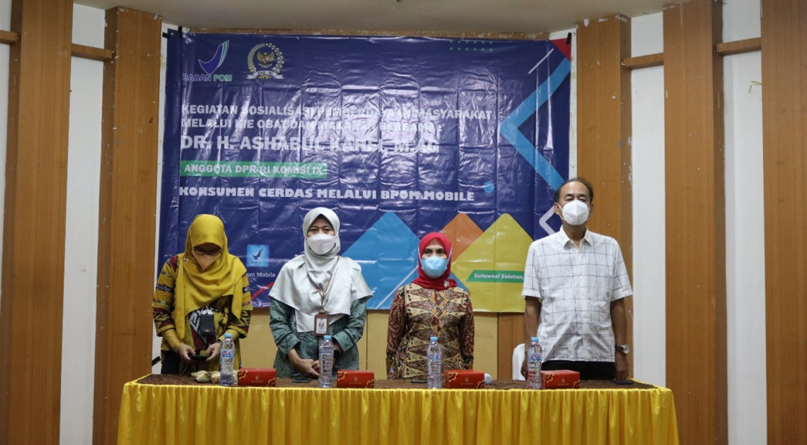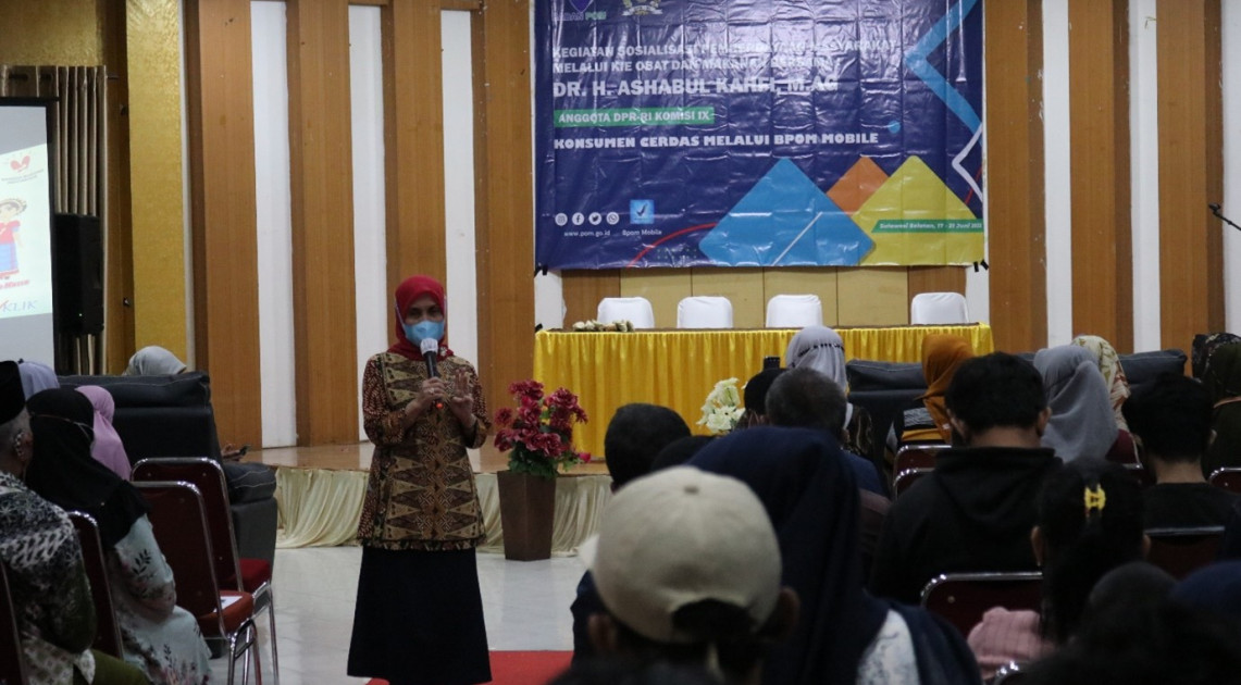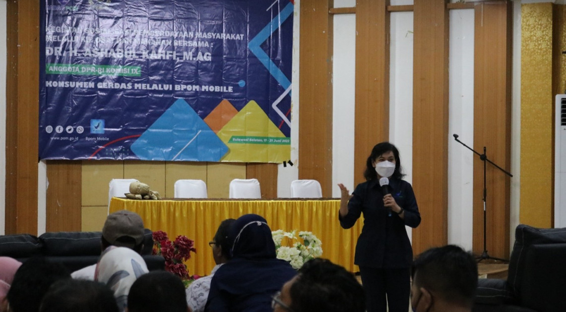 "Konsumen Cerdas Melalui BPOM Mobile", Badan POM terus berupaya melakukan upaya penguatan pengawasan obat dan makanan dengan menggandeng masyarakat sebagai konsumen. Pemberdayaan masyarakat Pemberdayaan melalui pemberian komunikasi, informasi dan edukasi (KIE) tentang obat dan makanan, dilakukan BPOM bersinergi dengan Komisi IX DPR RI. Kegiatan KIE dilaksanakan di Kecamatan Banta-Bantaeng, Sulawesi Selatan pada Senin, 20 Juni 2022. Pada sesi ini terlaksana 2 (dua) kegiatan dan peserta pada sesi pertama dihadiri oleh tenaga pendidik dan sesi kedua oleh masyarakat umum.