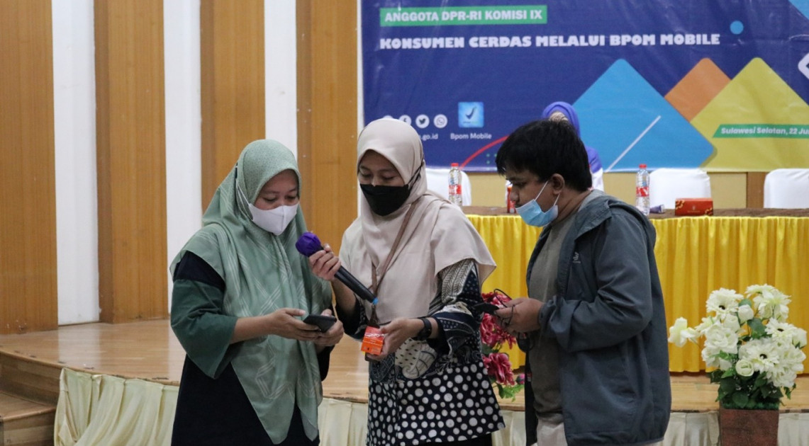 "Konsumen Cerdas Melalui BPOM Mobile", Badan POM terus berupaya melakukan upaya penguatan pengawasan obat dan makanan dengan menggandeng masyarakat sebagai konsumen. Pemberdayaan masyarakat Pemberdayaan melalui pemberian komunikasi, informasi dan edukasi (KIE) tentang obat dan makanan, dilakukan BPOM bersinergi dengan Komisi IX DPR RI. Kegiatan KIE dilaksanakan di Kecamatan Banta-Bantaeng, Sulawesi Selatan pada Rabu, 22 Juni 2022. Pada sesi ini terlaksana 2 (dua) kegiatan dan peserta pada sesi pertama dihadiri masyarakat umum dari daerah Karungrung dan sesi kedua dari Kelurahan Laikang, Kecamatan Biring Kanaya, Kecamatan Mariso, Kecamatan Rappocini, Kelurahan Sudiang, Kecamatan Biringkanaya.