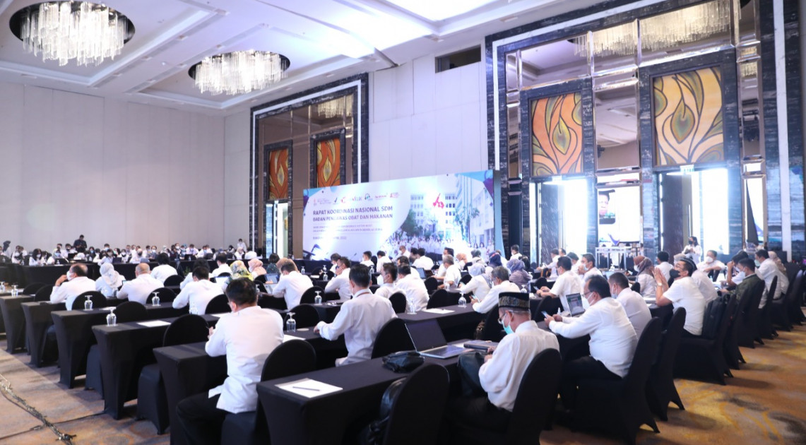 Bandung – Badan POM menyelenggarakan Rapat Koordinasi Nasional Sumber Daya Manusia (RAKORNAS SDM) Badan Pengawas Obat dan Makanan selama tiga hari pada Rabu-Jumat (19-21/04/2022). Kegiatan yang diselenggarakan secara hybrid tersebut dibuka langsung oleh Kepala Badan POM RI, Penny K. Lukito dan dihadiri oleh sebanyak 150 peserta luring, yang terdiri dari Kepala Balai Besar/Balai/Loka POM, peserta perwakilan dari Calon Pegawai Negeri Sipil (CPNS) Badan POM Tahun Anggaran 2022, Talent Pool, serta Perwakilan Alumni Tugas Belajar (Tubel) dan Izin Belajar (Ibel).