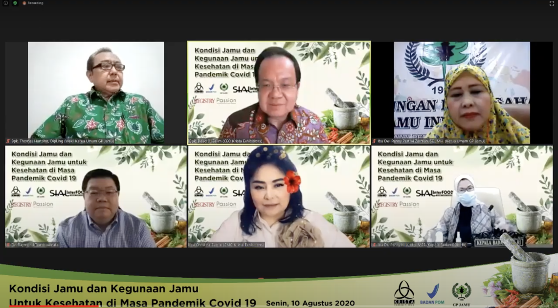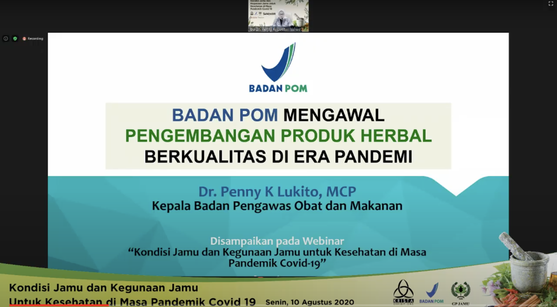 Senin (10/08), Kepala Badan POM RI, Penny K. Lukito menjadi salah satu narasumber dalam seminar online/webinar yang diselenggarakan Gabungan Pengusaha (GP) Jamu bersama Krista Exhibitions bertema “Kondisi Jamu dan Kegunaan Jamu untuk Kesehatan di masa Pandemi COVID-19”. Selain Kepala Badan POM, webinar juga menghadirkan narasumber Ketua Umum GP Jamu, Dwi Ranny Pertiwi; Molecular Pharmologist Dexa Group, Raymond R. Tjandrawinata; Wakil Ketua Umum GP Farmasi, Jony Yuwono; Direktur Utama PT. Indofarma, Arief Pramuhanto; dan Sekjen GP Jamu, Rusdiyanto.