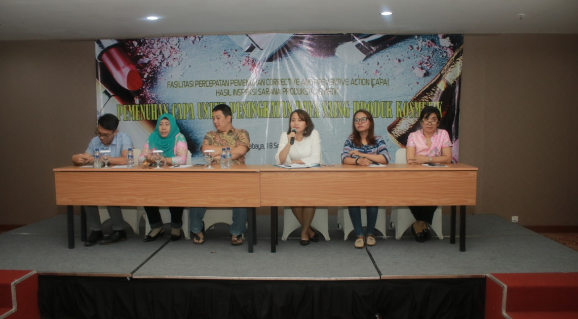 Dalam upaya dan sebagai strategi peningkatan penerapan CPKB pada industri kosmetika khususnya meningkatkan pemahaman pelaku usaha terkait CAPA, maka pada hari Selasa tanggal 28 September 2018, Direktorat Pengawasan Kosmetik menyelenggarakan kegiatan Fasilitasi Percepatan Pemenuhan Corrective and Preventive Action (CAPA) Hasil Inspeksi Sarana Produksi Kosmetik dengan tema “Pemenuhan CAPA untuk Peningkatan Daya Saing Produk Kosmetik” di Hotel Santika Premiere Gubeng, Surabaya yang dihadiri oleh 50 peserta dari 32 industri kosmetik yang ada di wilayah Jawa Timur.