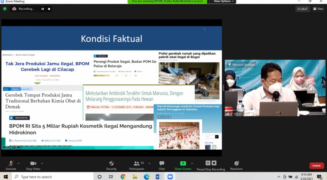 Kegiatan dilakukan 2 hari dan dibuka oleh Dra. Rita Endang, Apt, M.Kes selaku Plt Deputi Bidang Pengawasan Obat dan NAPPZA pada tanggal 23 Maret 2021, dengan dihadiri oleh Asosiasi dan pelaku usaha pada hari pertama, yaitu: