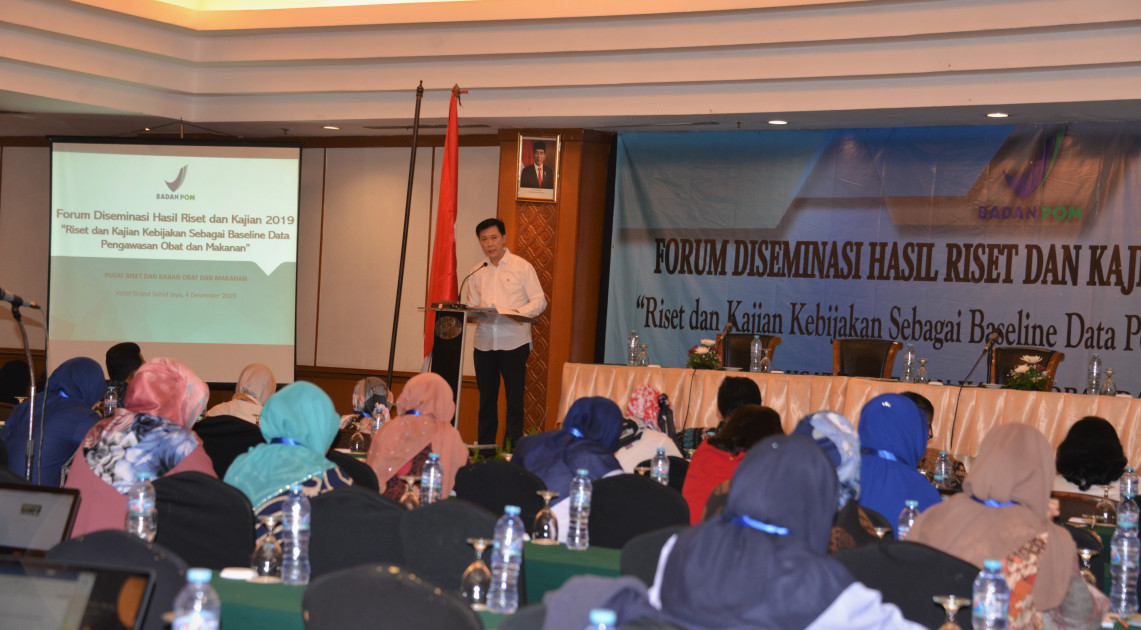 Jakarta - Plt. Sekretaris Utama Badan POM, Reri Indriani membuka secara resmi Forum Diseminasi Hasil Riset Dan Kajian Obat Dan Makanan Tahun 2019 yang pada tahun ini mengambil tema “Riset dan Kajian Kebijakan untuk Mendukung Efektivitas Pengawasan Obat dan Makanan”, Rabu (04/12) di Hotel Grand Sahid Jaya Jakarta. Forum ini dihadiri oleh sekitar 120 orang peserta terdiri dari perwakilan 24 unit kerja di lingkungan Badan POM Pusat, 34 Balai Besar/Balai POM dan 40 Loka POM, serta instansi terkait di luar Badan POM yaitu Badan Perencanaan Pembangunan Nasional (Bappenas), Badan Pusat Statistik (BPS), Badan Standarisasi Nasional (BSN), Lembaga Ilmu Pengetahuan Indonesia (LIPI), Kementerian Kesehatan, Kementerian Perdagangan, Lembaga Administrasi Negara (LAN) dan Kementerian Riset Teknologi dan Pendidikan Tinggi serta beberapa narasumber/pakar diantaranya Dr. Pungkas Bahjuri Ali dari Bappenas dan dr. M. Fikru Rizalh dari Universitas Gadjah Mada.