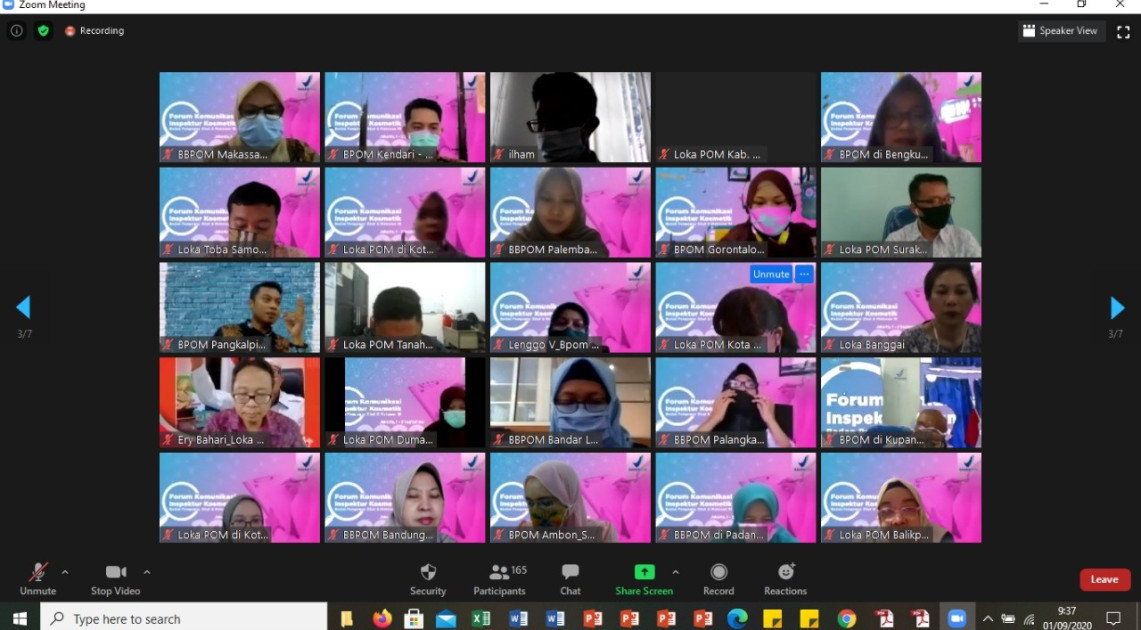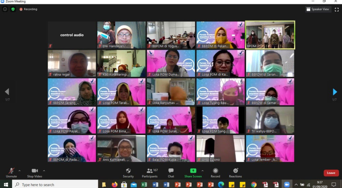 Berkenaan dengan hal tersebut, maka Direktorat Pengawasan Kosmetik mengadakan kegiatan Forum Komunikasi Inspektur Kosmetik secara daring dan luring di Hotel Pullman Jakarta Indonesia Thamrin CBD pada tanggal 1 - 2 September 2020. Kegiatan Forkom diikuti oleh 170 orang peserta dari 73 Balai Besar/ Balai/ Loka POM di seluruh Indonesia dan Pusat. Selama Forkom, peserta mendapatkan materi dari narasumber pusat berupa updating regulasi terkini di bidang kosmetik, kebijakan pengawasan dan pelayanan publik selama masa pandemi, mekanisme audit dan inspeksi sarana kosmetik selama masa pandemi dan juga sharing pengalaman dari inspektur di daerah terkait permasalahan pengawasan kosmetik selama masa pandemi.