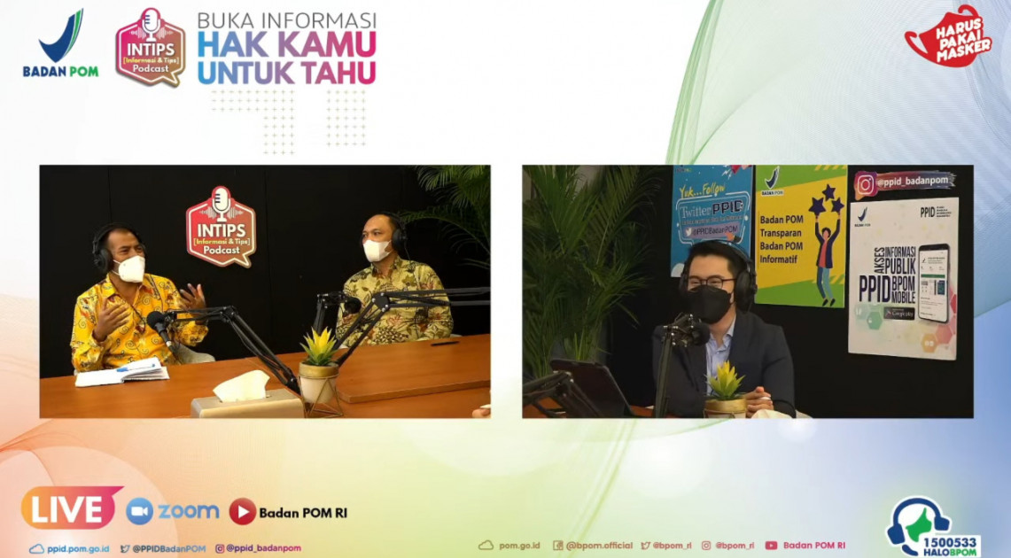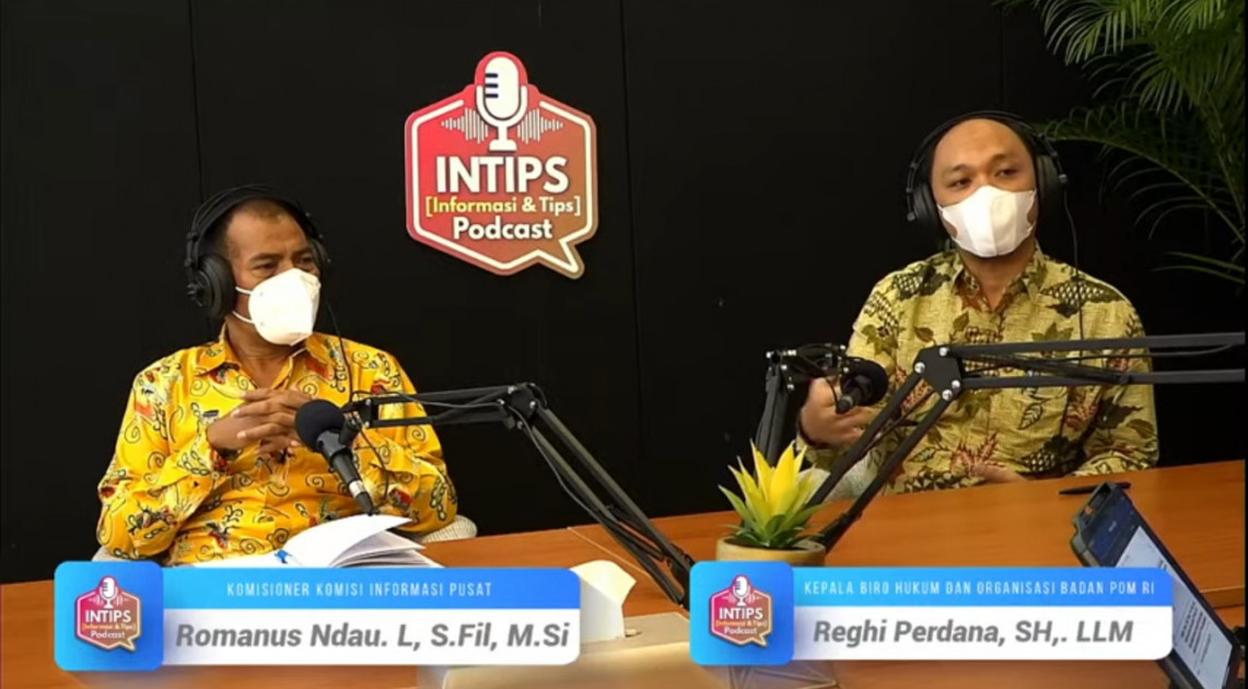 Rabu (28/04), Badan POM menggelar INTIPS (Informasi dan Tips) Podcast bertajuk “Buka Informasi, Hak Kamu Untuk Tahu!”. Kegiatan ini dihadiri oleh Sekretaris Utama Badan POM, Elin Herlina dan Kepala Biro Hukum dan Organisasi, Reghi Perdhana. Dengan menghadirkan pula narasumber dari Komisioner Komisi Informasi Pusat, Romanus Ndau dan Ario Astungkoro sebagai host. Kegiatan tersebut diikuti oleh setidaknya 460 peserta secara daring.