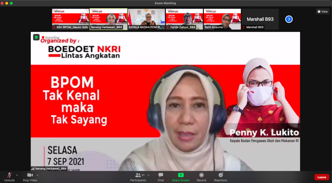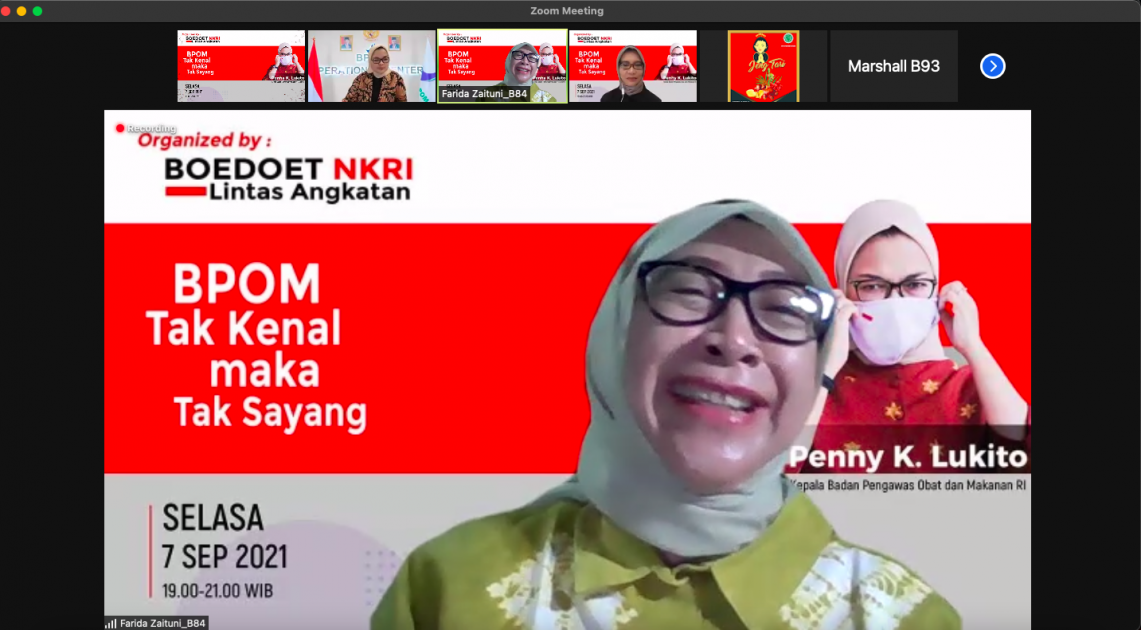 Jakarta - Kepala Badan POM RI, Penny K. Lukito menjadi Narasumber dalam Acara Dialog Daring yang diselenggarakan oleh Alumni Sekolah Menengah Atas Negeri 1 (SMAN 1) Jakarta atau Boedoet. Dialog kali ini bertajuk “Ngobrol Asik tentang BPOM, Tak Kenal Maka Tak Sayang”, Selasa (07/09).