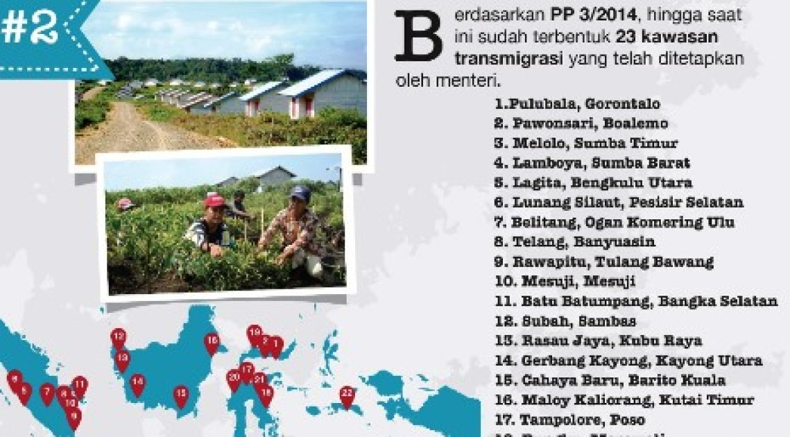 Berdasarkan Peraturan Pemerintah Nomor 3 Tahun 2014, hingga saat ini sudah terbentuk 23 kawasan transmigrasi yang telah ditetapkan oleh menteri. Lokasi tersebut diantaranya, Kawasan Salor, Kabupaten Merauke; Kawasan Kobisonta, Kabupaten Maluku Tengah; Kawasan Air Terang, Kabupaten Buol; Kawasan Bungku, Kabupaten Morowali; Kawasan Pawonsari, Kabupaten Boalemo; Kawasan Subah, Kabupaten Sambas; Kawasan Gerbang Kayong, Kabupaten Kayong Utara; dan Kawasan Telang, Kabupaten Banyuasin. Sebelum terbentuk menjadi kawasan transmigrasi, pemerintah telah menetapkan 48 Kota Terpadu Mandiri (KTM). KTM merupakan embrio dari kawasan transmigrasi. Pada tahun 2016 ini, pemerintah telah memberangkatkan 1.658 Kepala Keluarga (per Desember 2016).
