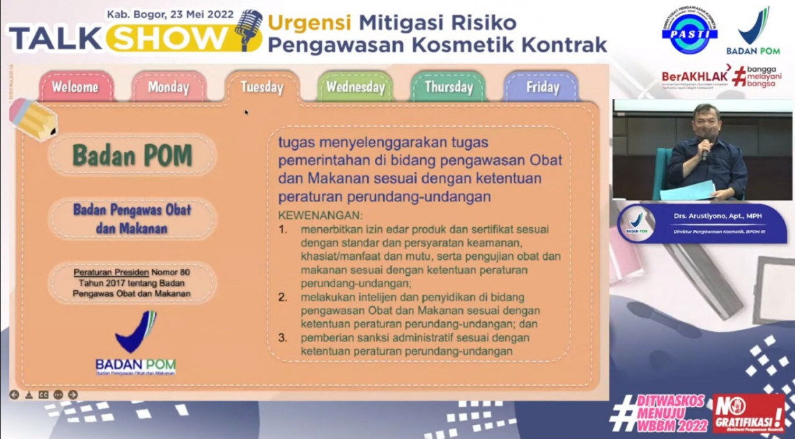 Jakarta – Badan POM tunjukkan komitmen dalam pembinaan pelaku usaha kosmetika melalui Talkshow bertajuk “Urgensi Mitigasi Risiko Pengawasan Kosmetika Kontrak”, Senin (23/05/2022). Talkshow ini diikuti oleh peserta yang berasal dari Asosiasi dan Penanggung Jawab pelaku usaha kosmetik di seluruh Indonesia.