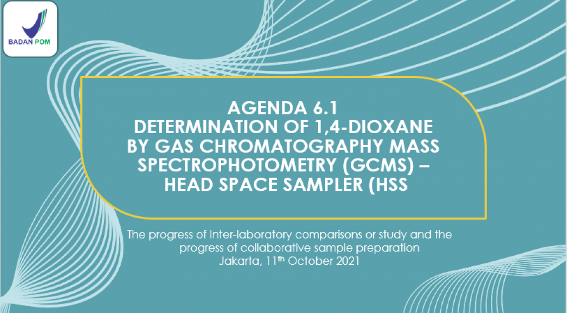 Dalam ACTLC Meeting ke-17, Indonesia memaparkan progress report terhadap pengembangan metode analisis Determination of 1,4 Dioxane in Cosmetics Using Head Space Sampler Gas Chromatography - Mass Spectrophotometry. Validasi Metode Analisis tersebut akan menggunakan 1,4-Dioxane-d8 sebagai internal standards yang akan diselesaikan pada akhir tahun ini.