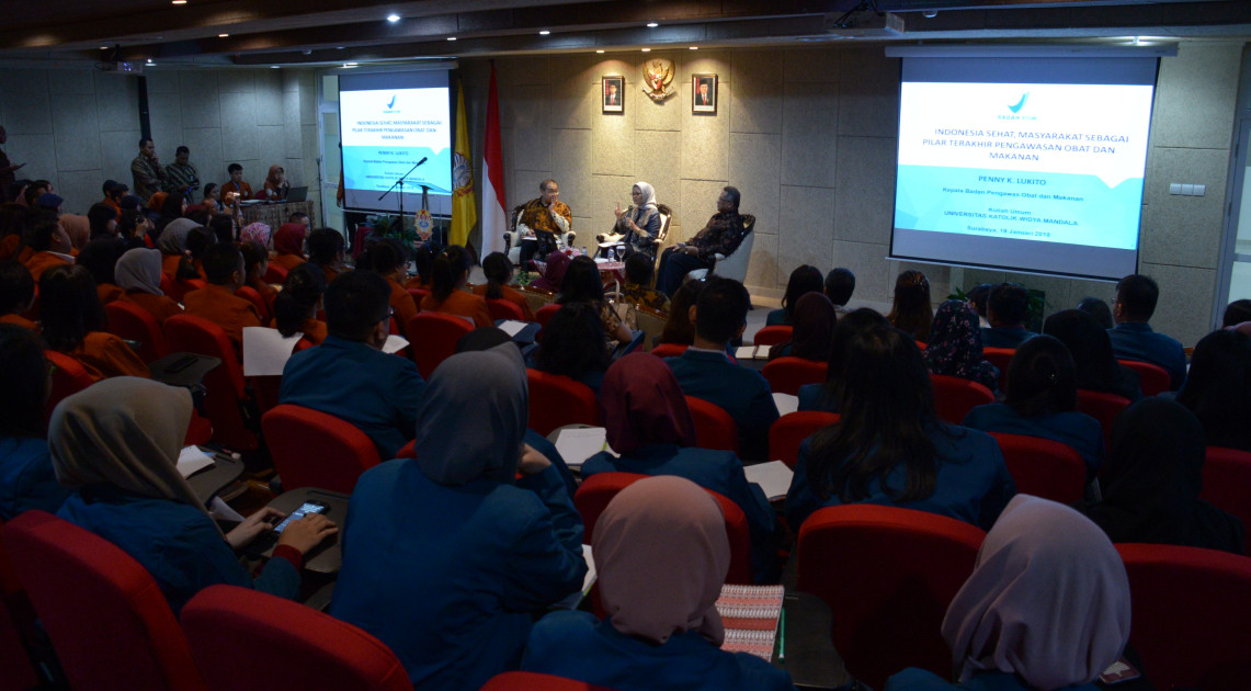 Surabaya - "Indonesia tidak kalah dengan negara lain terkait potensi obat dan makanan, didukung oleh SDM yang berkualitas. Generasi muda jangan pernah takut bermimpi. Kalian mempunyai potensi untuk memajukan bangsa ini. Selalu belajar dari pengalaman, karena pengalaman itu membuat kita menjadi lebih kuat". Demikian disampaikan Kepala Badan POM RI, Penny K. Lukito pada saat memberikan kuliah umum di Universitas Katolik Widya Mandala Surabaya (19/01).
