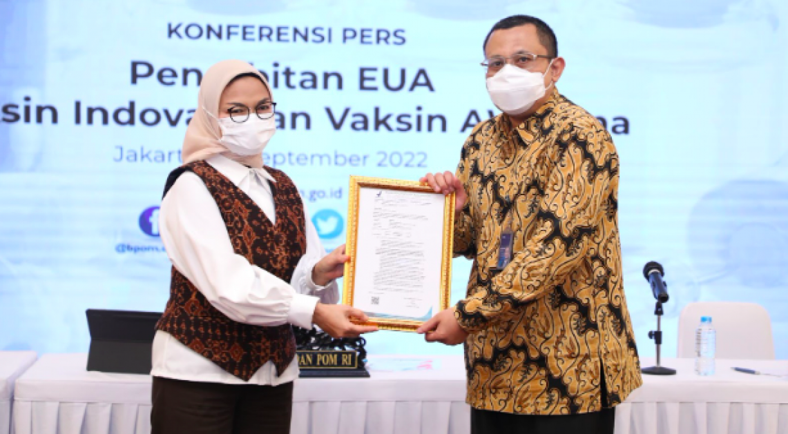 Penyerahan EUA diberikan secara langsung oleh Kepala BPOM RI, Penny K. Lukito kepada Direktur Operasi PT Bio Farma, M. Rahman Roestan dan Direktur Utama PT Etana Biotechnologies Indonesia, Nathan Tirtana, Jumat (30/09/2022). Penyerahan dilakukan bersamaan dengan penjelasan pers terkait penerbitan EUA tersebut.