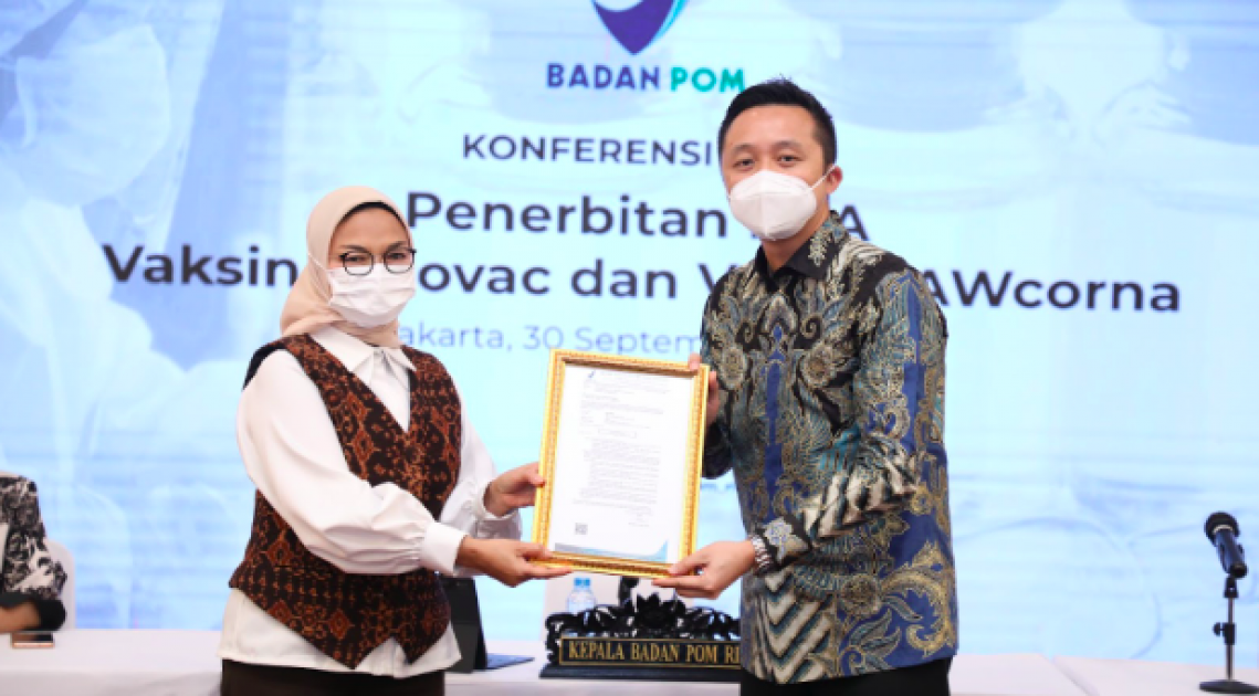 Lebih lanjut, sesuai persyaratan EUA, BPOM telah melakukan evaluasi terhadap aspek khasiat, keamanan, dan mutu mengacu pada standar evaluasi vaksin COVID-19, serta evaluasi terhadap pemenuhan Cara Pembuatan Obat yang Baik (CPOB). Melalui pertimbangan terhadap aspek keamanan, efikasi/imunogenisitas, mutu, dan pemenuhan CPOB, maka BPOM telah menyetujui penerbitan EUA Vaksin Indovac dengan indikasi sebagai imunisasi aktif untuk pencegahan COVID-19 yang disebabkan oleh SARS CoV-2 pada individu berusia 18 tahun ke atas. Sementara Vaksin AWcorna disetujui mendapatkan EUA untuk indikasi pencegahan infeksi virus SARS CoV-2 pada individu usia 18 tahun ke atas.