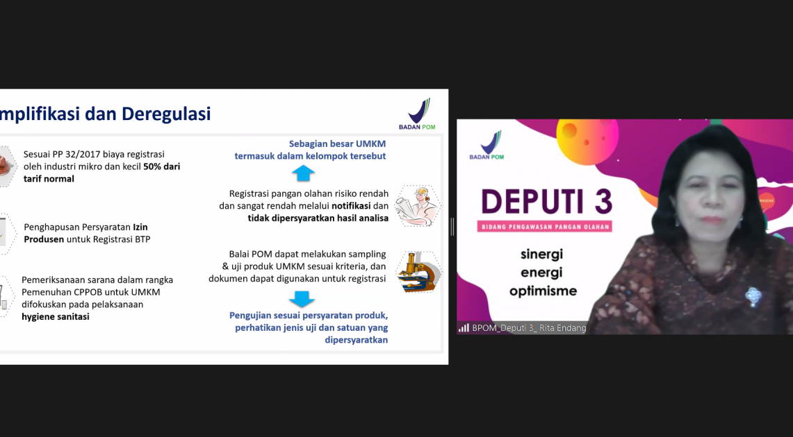 “Badan POM juga mendigitalisasi perizinan untuk mempermudah UMKM memenuhi prosedur dan persyaratan registrasi. Pengajuan izin penerapan Cara Pembuatan Pangan Olahan yang Baik (CPPOB) sudah dapat dilakukan secara elektronik melalui situs e-sertifikasi.pom.go.id. UMKM juga bisa menyampaikan pertanyaan melalui fitur live chat pada situs registrasipangan.pom.go.id atau melalui Contact Center HALOBPOM. Selain itu, Badan POM juga menyelenggarakan kegiatan komunikasi, informasi, dan edukasi (KIE), seperti seminar online, webinar, forum, bimbingan teknis, dan coaching clinic yang dapat diikuti oleh UMKM,” terang Rita Endang lagi.