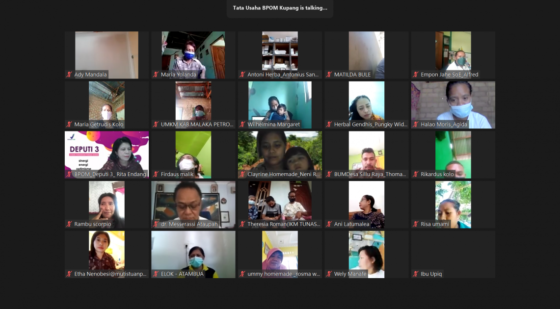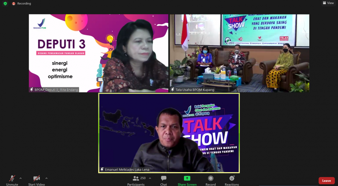 Kupang – Jumat (13/08), Badan POM melalui Balai POM di Kupang selenggarakan Talkshow “Kiat-Kiat Menjadi Usaha Mikro, Kecil, dan Menengah (UMKM) Obat dan Makanan yang Berdaya Saing di Tengah Pandemi”. Talkshow ini diadakan untuk berbagi informasi dengan pelaku UMKM di Nusa Tenggara Timur (NTT) dalam menghadapi tantangan di masa pandemi. Di antaranya terkait dengan keterbatasan pemahaman pelaku UMKM pada regulasi serta permodalan untuk menerapkan higiene dan sanitasi serta cara pembuatan produk yang baik, inkonsistensi mutu produk setiap bets, serta kemasan dan label yang masih sederhana.