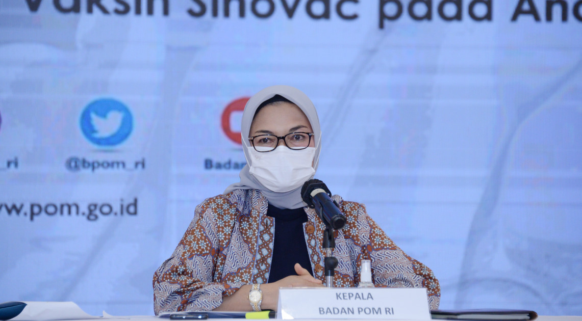 Jakarta - Kepala Badan POM RI, Penny K Lukito mengumumkan secara resmi persetujuan penggunaan Vaksin Sinovac (Vaksin Coronavac produksi Sinovac Life Science Co., Ltd China dan Vaksin COVID-19 PT Bio Farma) untuk anak usia 6-11 tahun, pada konferensi pers yang dilaksanakan secara daring, Senin (01/11). Persetujuan ini diperoleh setelah dilakukan pembahasan dan pengkajian bersama Tim Komite Nasional Penilai Khusus Vaksin Corona Virus Disease 2019 (COVID-19) terhadap aspek khasiat dan keamanannya. Dengan adanya persetujuan ini, maka Vaksin Sinovac adalah vaksin yang pertama disetujui untuk digunakan pada anak usia 6-11 tahun.