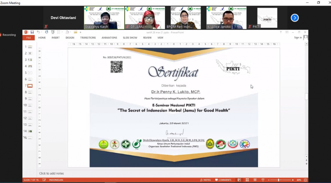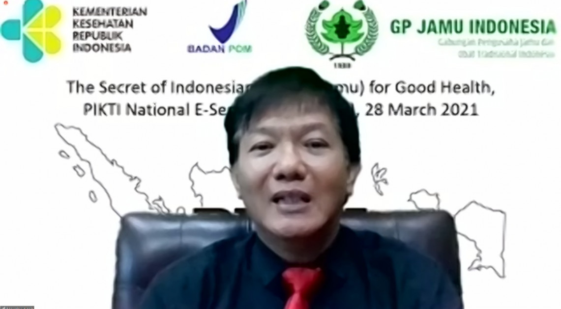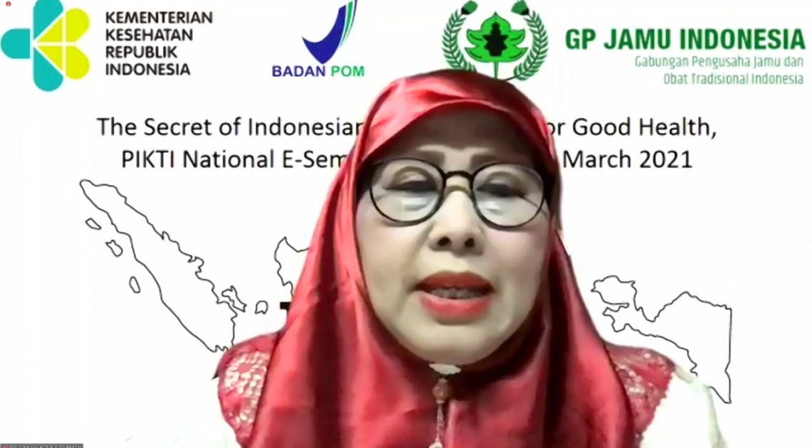 Jakarta – Perkumpulan Induk Organisasi Kesehatan Tradisional Indonesia (PIKTI) menggelar kegiatan E-seminar Series 36 bertajuk ''The Secret of Indonesian Herbal (Jamu) for Good Health'' pada hari Minggu, (28/03). Dalam kesempatan tersebut, Kepala Badan POM RI yang diwakilkan oleh Deputi Bidang Pengawasan Obat Tradisional, Suplemen Kesehatan dan Kosmetik, Reri Indriani menjadi keynote speaker dengan membahas topik Kebijakan Pengembangan dan Hilirisasi Produk Obat Tradisional.