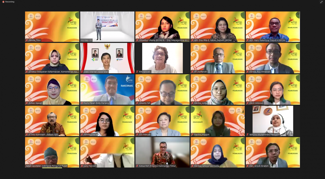 Jakarta – Badan POM ikut berpartisipasi pada kegiatan “Rapat Kerja Nasional dan Pertemuan Ilmiah Tahunan Ikatan Apoteker Indonesia Virtual Tahun 2021” yang berlangsung pada tanggal 26 – 28 Agustus 2021. Pertemuan Ilmiah Tahunan (PIT) merupakan kegiatan rutin tahunan Ikatan Apoteker Indonesia (IAI) yang bertujuan meningkatkan kapasitas dan wawasan apoteker dalam praktik kefarmasian. Ini adalah kali kedua PIT dilaksanakan secara online di masa pandemi. Dengan mengambil tema “The Opportunities of Pharmacists’ Digital Services in Pandemic Recovery”, kegiatan dihadiri secara virtual oleh sekitar 5.000 apoteker se-Indonesia.