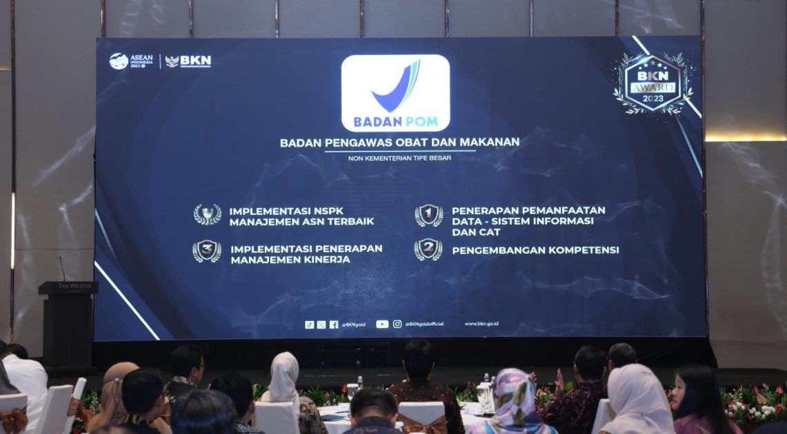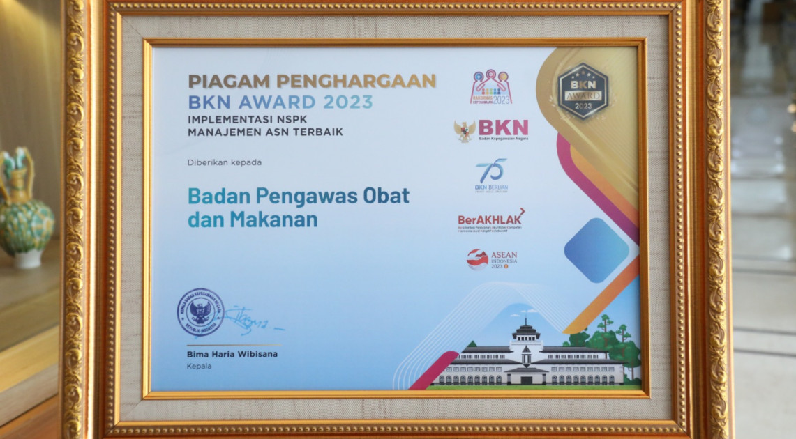 Jakarta – “Lebih dari 4 juta aparatur sipil negara (ASN) akan menjadi garda terdepan dalam melangkah menuju Indonesia Emas 2045,” ucap Kepala BPOM, Penny K. Lukito selepas menerima empat (4) penghargaan dari Badan Kepegawaian Negara (BKN), Senin (04/09/2023). Empat penghargaan yang diterima BPOM antara lain; peringkat kedua pada kategori utama Implementasi Norma, Standar, Prosedur dan Kriteria (NSPK) Manajemen ASN Terbaik; peringkat kedua Kategori Pengembangan Kompetensi; peringkat pertama Kategori Implementasi Pemanfaatan Data-Sistem Informasi dan CAT; dan peringkat ketiga pada Kategori Implementasi Manajemen Kinerja.