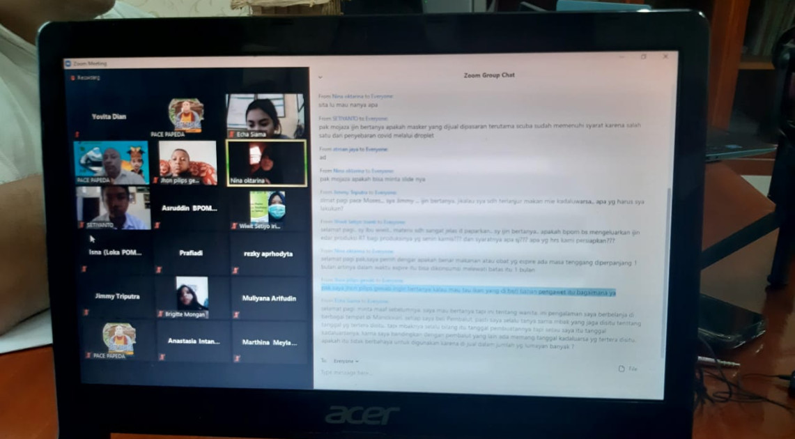 Pada hari Kamis tanggal 19 Juni 2020, Balai POM di Manokwari menyelenggarakan KIE Online kepada masyarakat Papua Barat melalui Zoom Meeting selama 2 jam. Kegiatan ini sebagai dukungan dan peran Balai Pengawas Obat dan Makanan di Manokwari dalam pencegahan penyebaran COVID-19. Informasi yang disebarluaskan terkait keamanan pangan saat berbelanja supaya masyarakat waspada dan memperhatikan protokol keamanan untuk pencegahan COVID-19 selama berbelanja. Selain melalui Zoom Meeting, acara juga disiarkan secara live melalui akun resmi facebook dan instagram BPOM Manokwari.