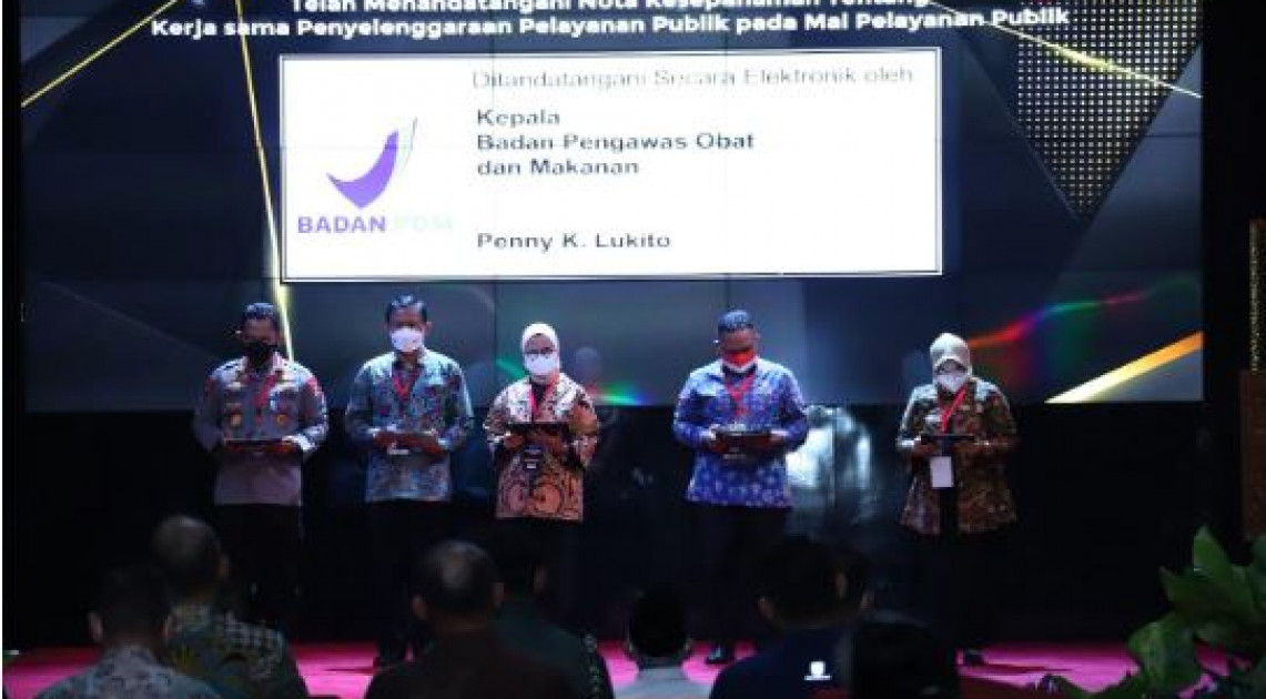 Jakarta - Badan POM berkomitmen mendukung percepatan pelayanan publik melalui Mal Pelayanan Publik (MPP) yang diinisiasi Kementerian Pendayagunaan Aparatur Negara dan Reformasi Birokrasi (Kementerian PANRB). Kepala Badan POM RI, Penny K Lukito bersama 17 pimpinan kementerian/lembaga dan BUMN hadir dalam penandatanganan Nota Kesepahaman untuk mempercepat penyelenggaraan MPP di seluruh Indonesia, Selasa (28/06/2022).