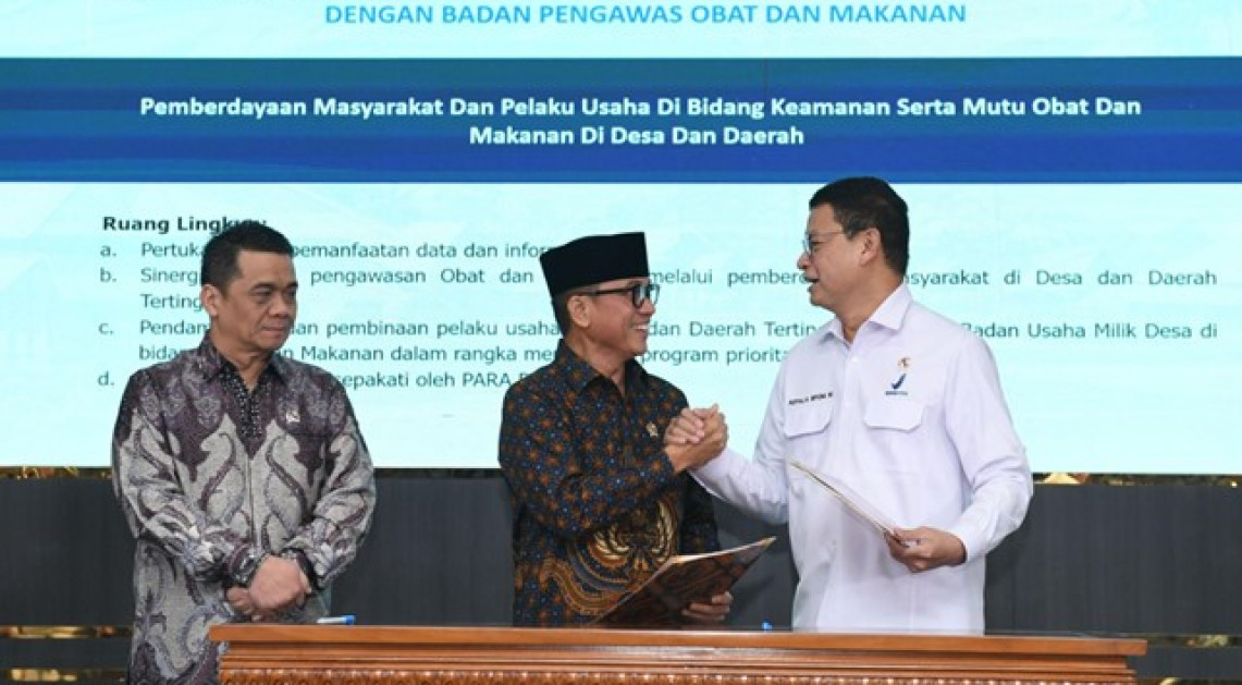 Jakarta - Kepala BPOM Taruna Ikrar bersama Menteri Desa dan Pembangunan Daerah Tertinggal (Mendes PDT) Yandri Susanto menandatangani Nota Kesepahaman tentang Pemberdayaan Masyarakat dan Pelaku Usaha di Bidang Keamanan serta Mutu Obat dan Makanan di Desa dan Daerah Tertinggal pada Kamis (27/2/2025) di kantor Kemendes dan PDT. Penandatanganan ini merupakan salah satu bentuk kolaborasi BPOM dengan Kemendes PDT dalam mewujudkan Asta Cita Presiden Prabowo ke-6.