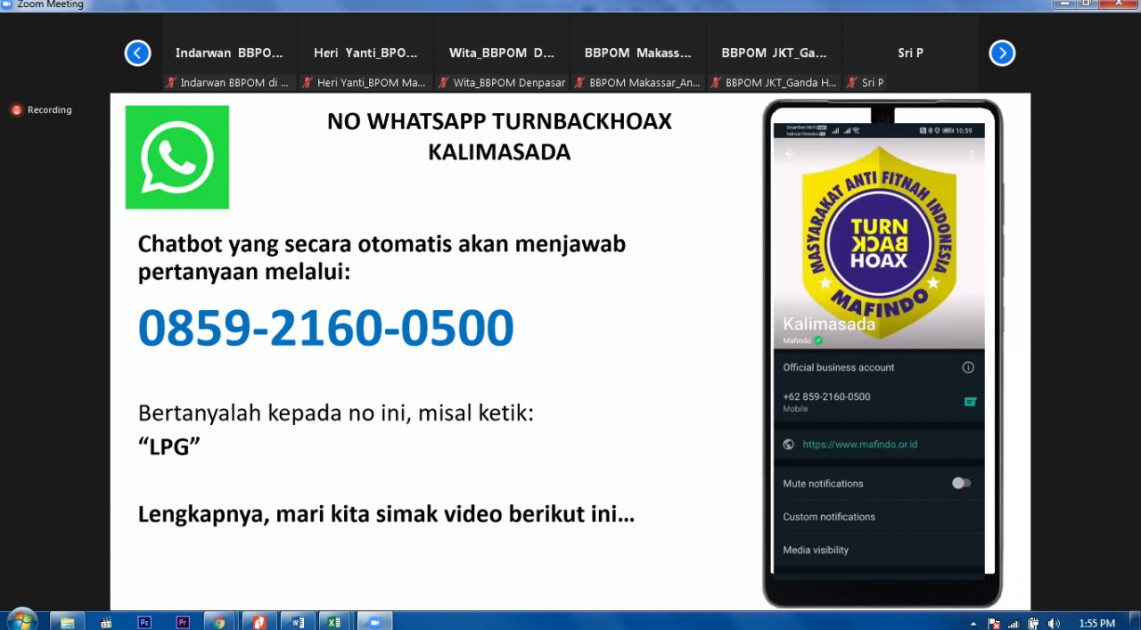 Dalam pelatihan yang dibimbing langsung oleh Ketua Presidium MAFINDO, Septiaji Eko Nugroho, dan Presidium Periksa Fakta, Eko Juniarto, peserta dibekali teori mengenali hoaks dan diajak praktik menganalisis informasi menggunakan sejumlah aplikasi online. Dengan pelatihan ini diharapkan jajaran Badan POM semakin mahir dalam menghalau informasi hoaks obat dan makanan. Hal ini akan memperkuat SDM Badan POM dalam memberikan edukasi yang benar kepada masyarakat agar terhindar dari informasi seputar Obat dan Makanan yang menyesatkan. (HM-Fathan)
