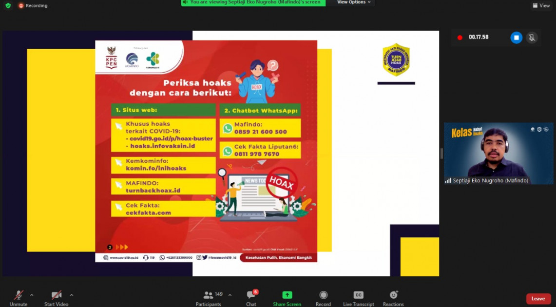 JAKARTA - Informasi hoaks yang beredar kian massif dan meresahkan masyarakat. Apa lagi di tengah pandemi, beragam hoaks seputar COVID-19 tak hanya beredar melalui platform media sosial, bahkan telah merambah ke media komunikasi keluarga seperti whatsapp. Kondisi ini tentu memerlukan penanganan segera karena membawa dampak terhadap masyarakat terutama terkait kesehatan.