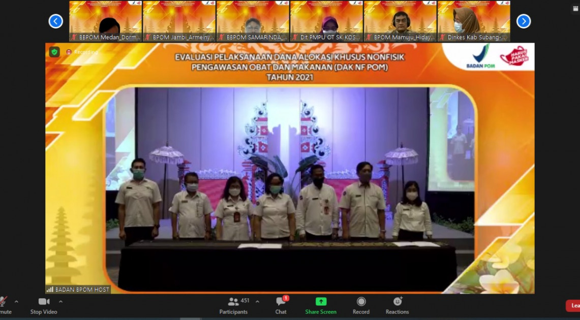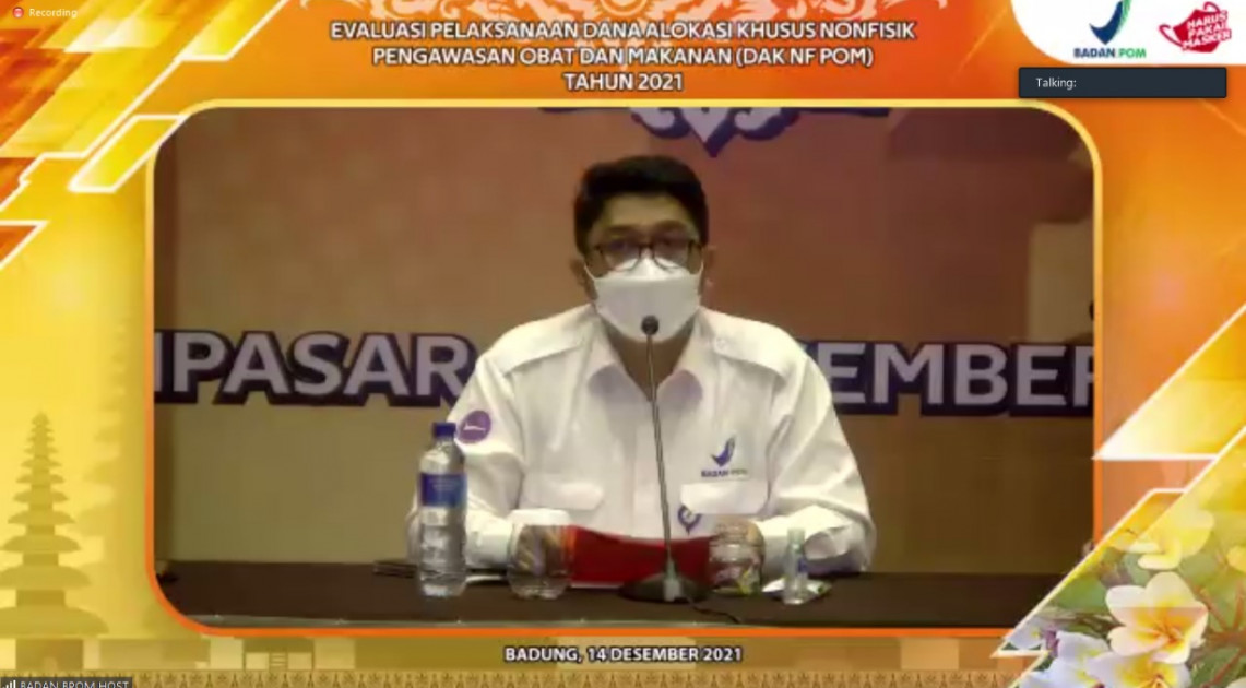 Denpasar – Rabu (14/12/2021), Badan POM menyelenggarakan “Rapat Evaluasi Pelaksanaan Dana Alokasi Khusus Nonfisik Pengawasan Obat dan Makanan (DAK Nonfisik POM) Tahun 2021” untuk menyinergikan upaya bersama dalam pengawasan Obat dan Makanan melalui pemanfaatan DAK Nonfisik POM. Pertemuan ini bertujuan untuk mengevaluasi kualitas pemanfaatan DAK Nonfisik POM selama tahun 2021 dan membahas arah kebijakan DAK Nonfisik POM di tahun 2022.