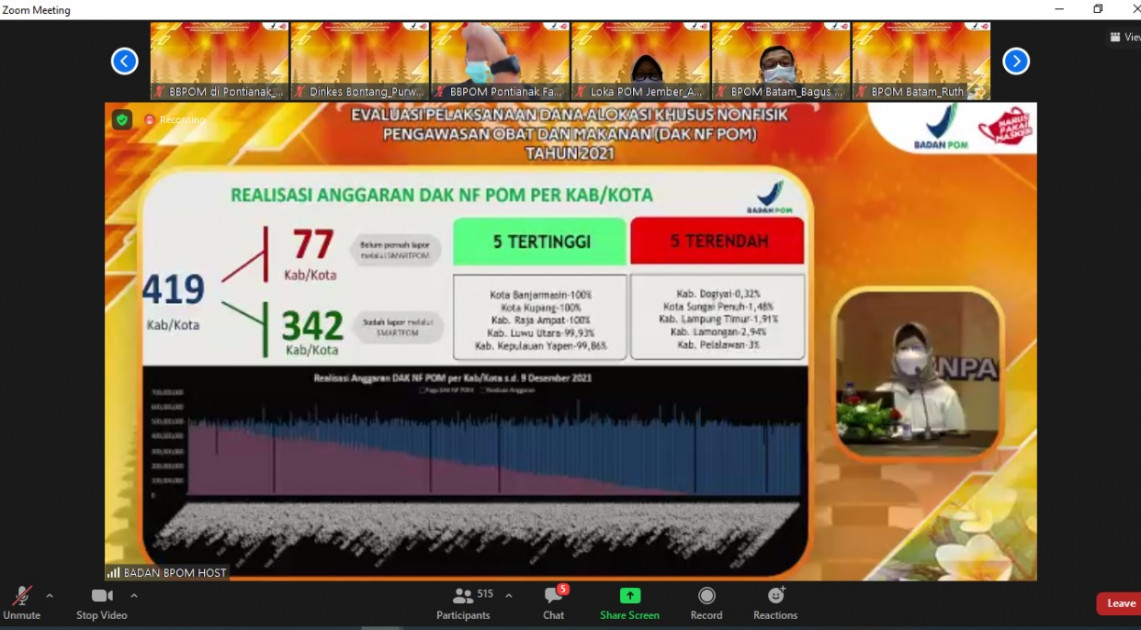 “Terkait hal ini, kami telah berkomunikasi dengan kementerian terkait di pusat. Namun demikian, hendaknya komitmen dan koordinasi di tingkat pemerintah daerah juga perlu ditingkatkan dalam proses persiapan, pelaksanaan, dan pencairan anggaran DAK ke depan,” ungkap Penny K. Lukito menjelaskan alasan rendahnya realisasi anggaran DAK Nonfisik POM TA 2021.