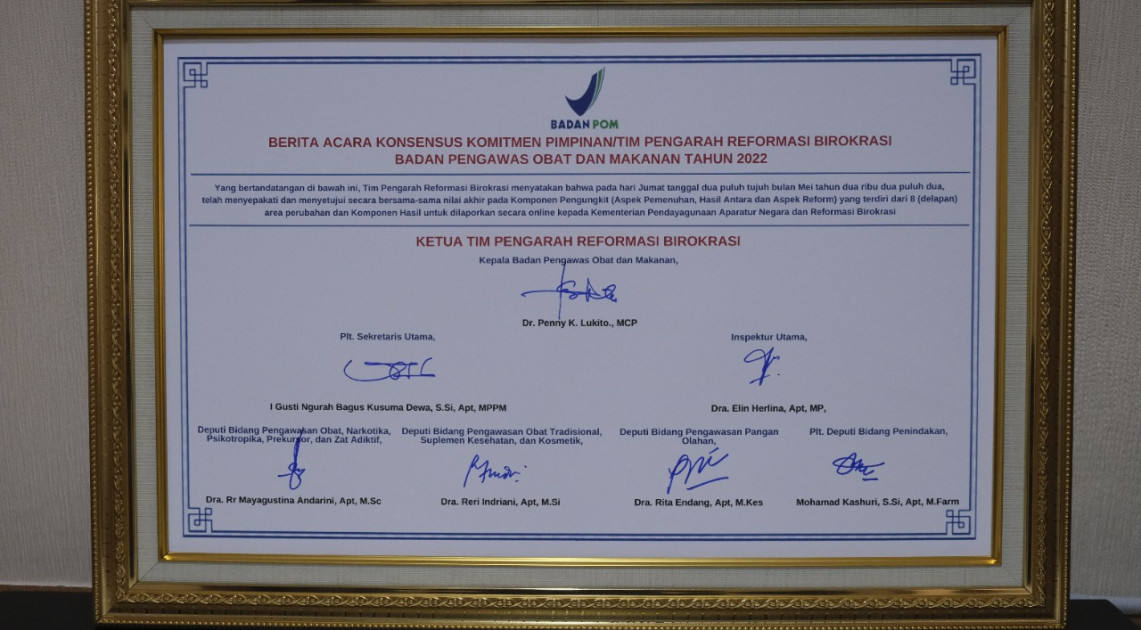 Kepala Badan POM pada kesempatan tersebut menyampaikan apresiasi atas kerja sama, kerja keras dan kerja nyata seluruh Tim RB Badan POM serta Tim Inspektorat Utama selaku TPI yang terus mengawal implementasi RB dan menghasilkan nilai indeks RB yang meningkat setiap tahunnya dan Konsensus PMPRB yang ditandatangani hari ini menjadi kesepakatan bersama antar seluruh jajaran Badan POM yang harus dapat dipertanggungjawabkan kepada para stakeholder dan masyarakat, bahwa Badan POM akan terus menyelenggarakan proses birokrasi yang akuntabel, efektif, dan efisien.